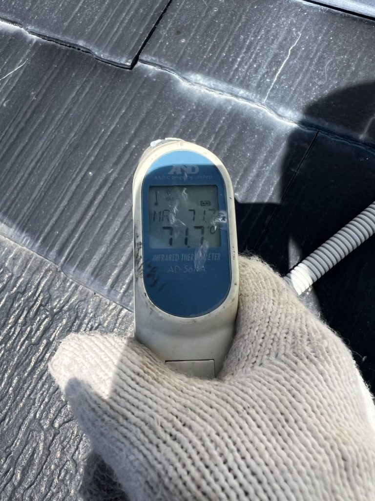 実体験をもとに屋根遮熱塗装と部屋の温度変化についてお伝えさせて頂きます。写真のように9月のスレート瓦屋根表面温度が計測器で70℃を越えています。初夏から真夏の最盛期には80℃を越える日もあるでしょう。