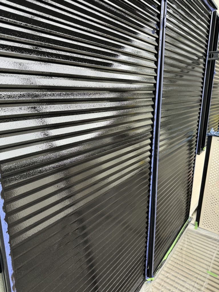 幕板は板金に吹付してある素材なので下塗りに錆止めを塗装します。仕上げに2液性弱溶剤シリコン塗料を2回塗りして仕上げます。