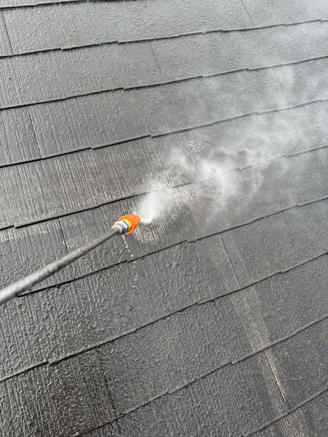 塗料の密着を確保するため、屋根や外壁など建物全体のコケ類や埃などを高圧洗浄機にてきれいに洗い流します。