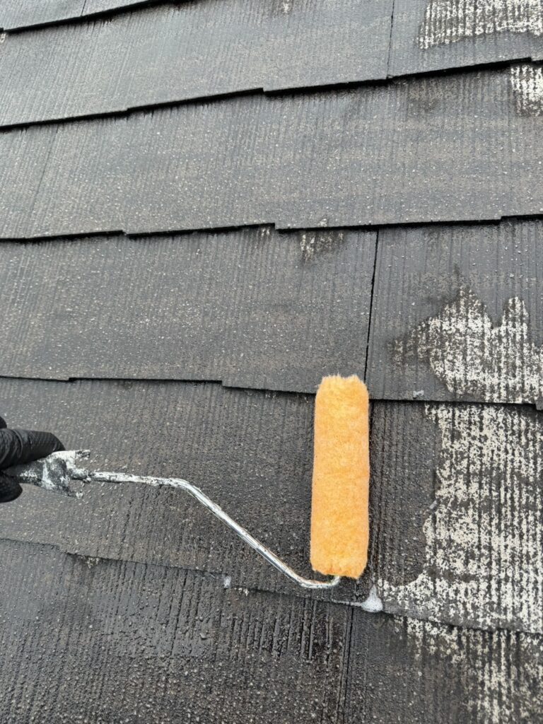 下地調整材は、仕上げ塗料が屋根材に過剰に吸い込まれるのを防ぐ役割を果たします。下地調整材を塗布後、仕上げ塗料を1回目、2回目と丁寧に塗り重ねることで屋根材に十分な塗膜の厚みを形成し、耐候性を高めることができます。この塗装工程により経年において塗料の持つ性能を発揮できるようになります。