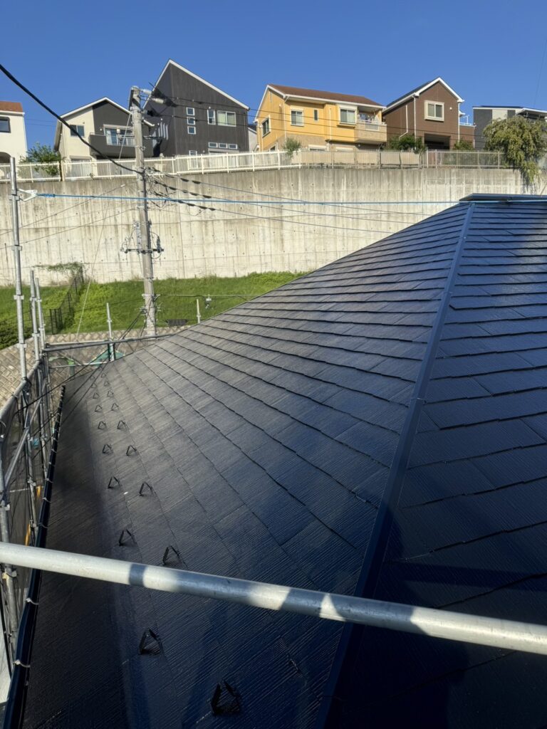 通常の塗装仕様ではこのような仕上がりにはなりませんし屋根材表面も、つるっとした感じにはなりません。一手間加えるだけで塗料が持つ耐候性に期待が持てます。