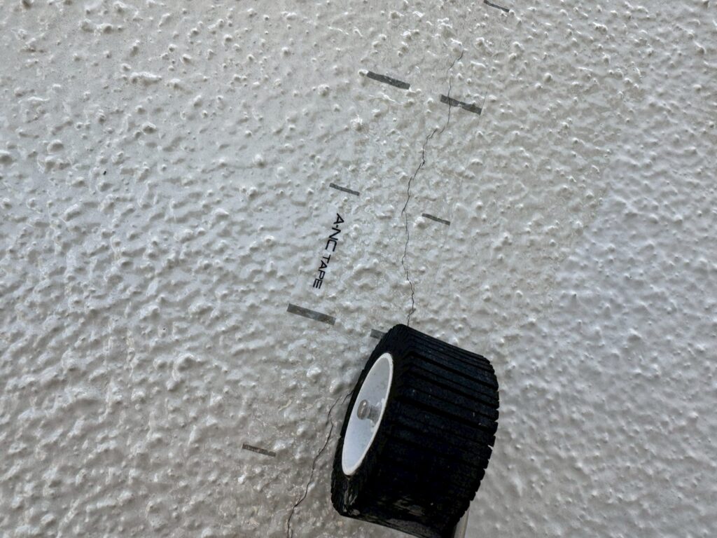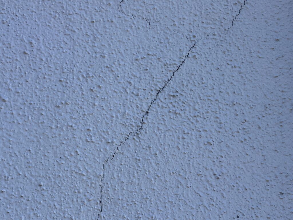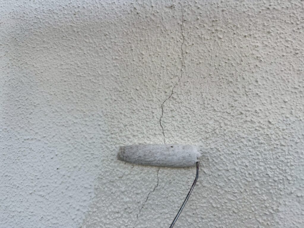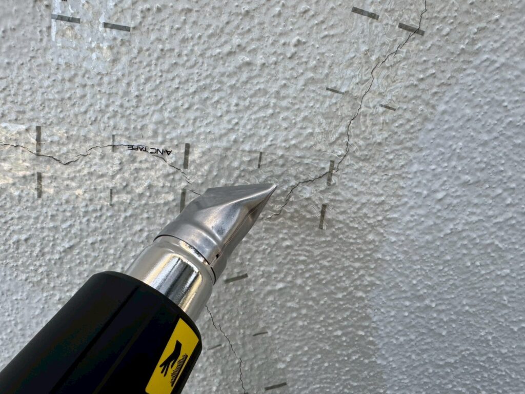 西面のモルタル面は下地がかなり劣化していたため、ひび割れ補修にタジマA-NC工法(ノンカットフィルム)にてひび割れを補修しました。