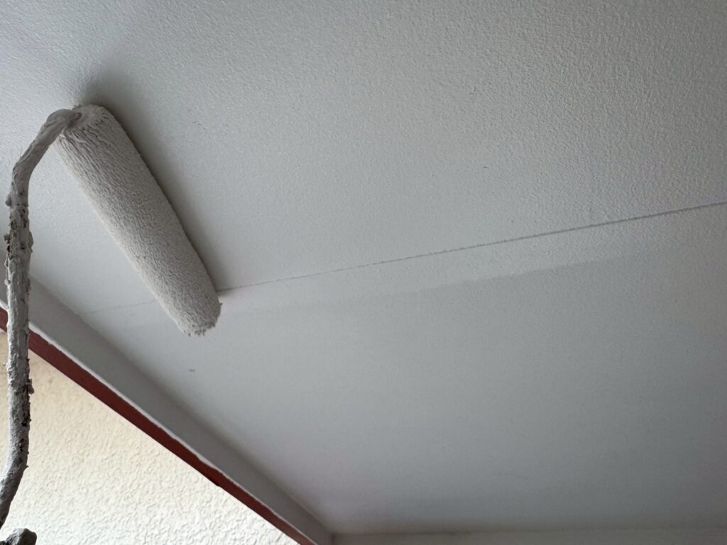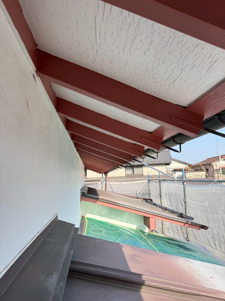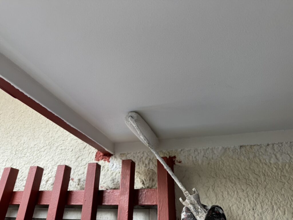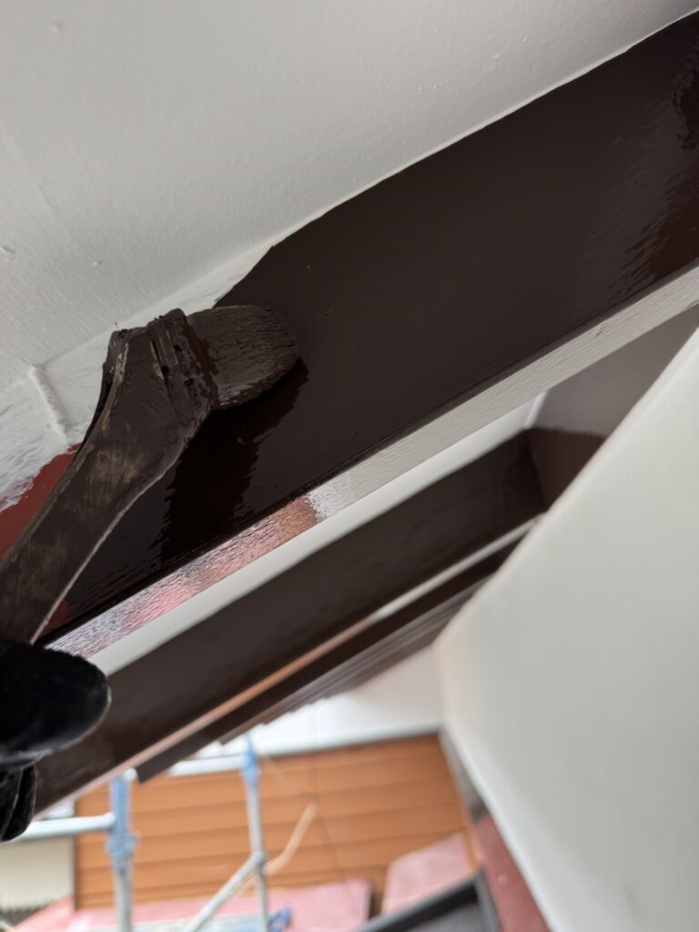 軒裏に付帯している化粧垂木を色分け塗装していきます。天井を先に仕上げてから垂木塗装に掛かります。