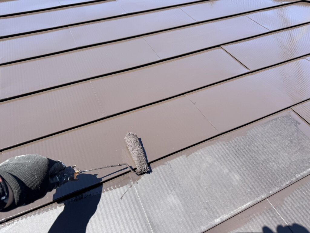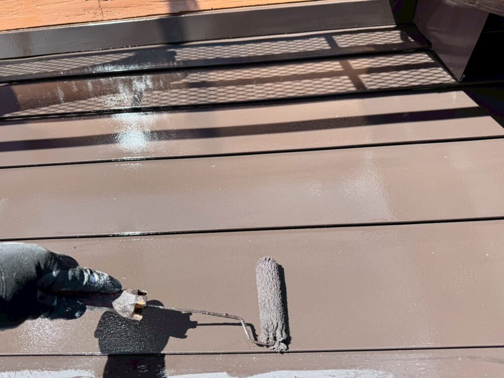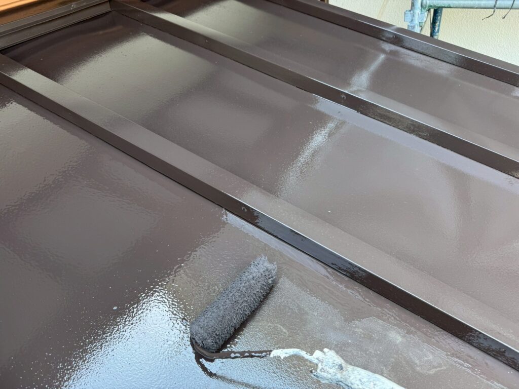 2液性エポキシ樹脂系さび止塗料を板金屋根全体に塗装していきます。