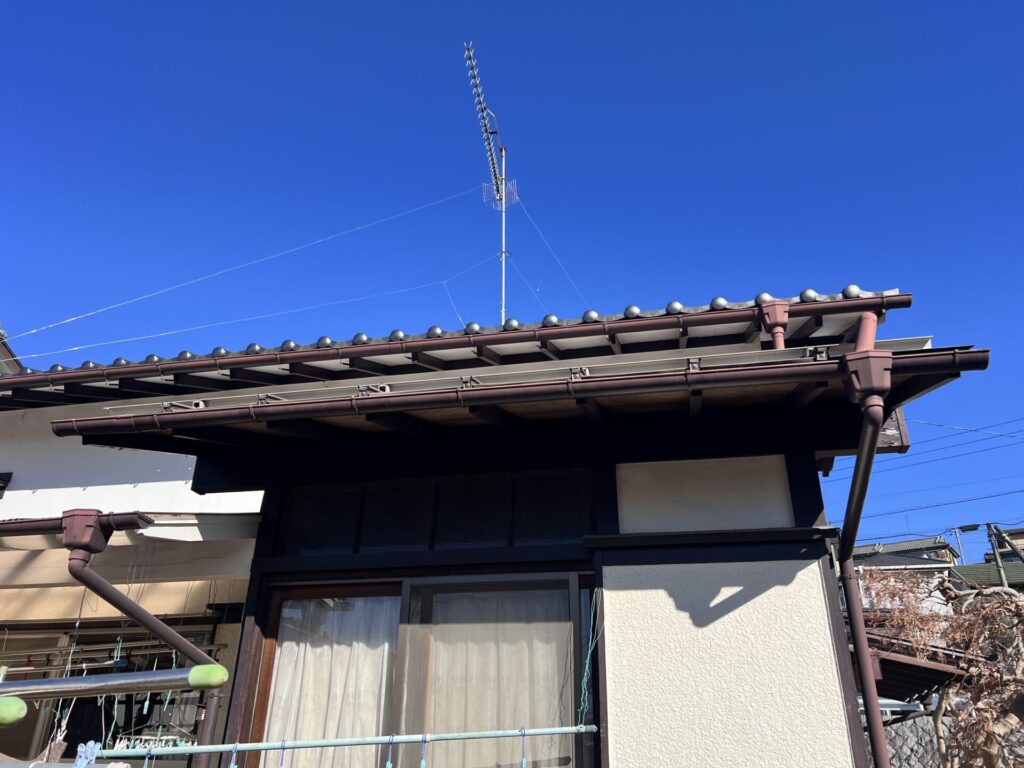 左写真は1階も塗装をしていないため既存塗装が風化して下地が見えています。これは剥離とは違う経年劣化になります。右側は前回の工事の際に葺き替えた屋根になります。左の屋根はこのような状態でも錆はありませんでした。吹き替えたガルバリウム屋根は色褪せはありますがもちろん錆などの異常はありませんでした。