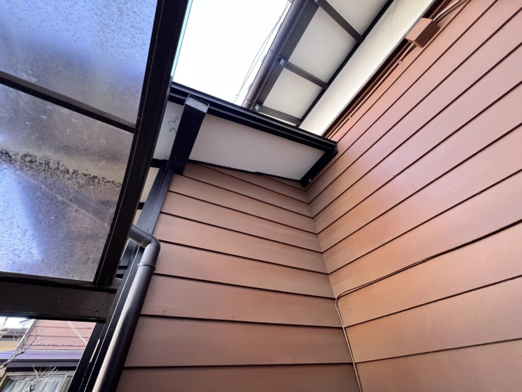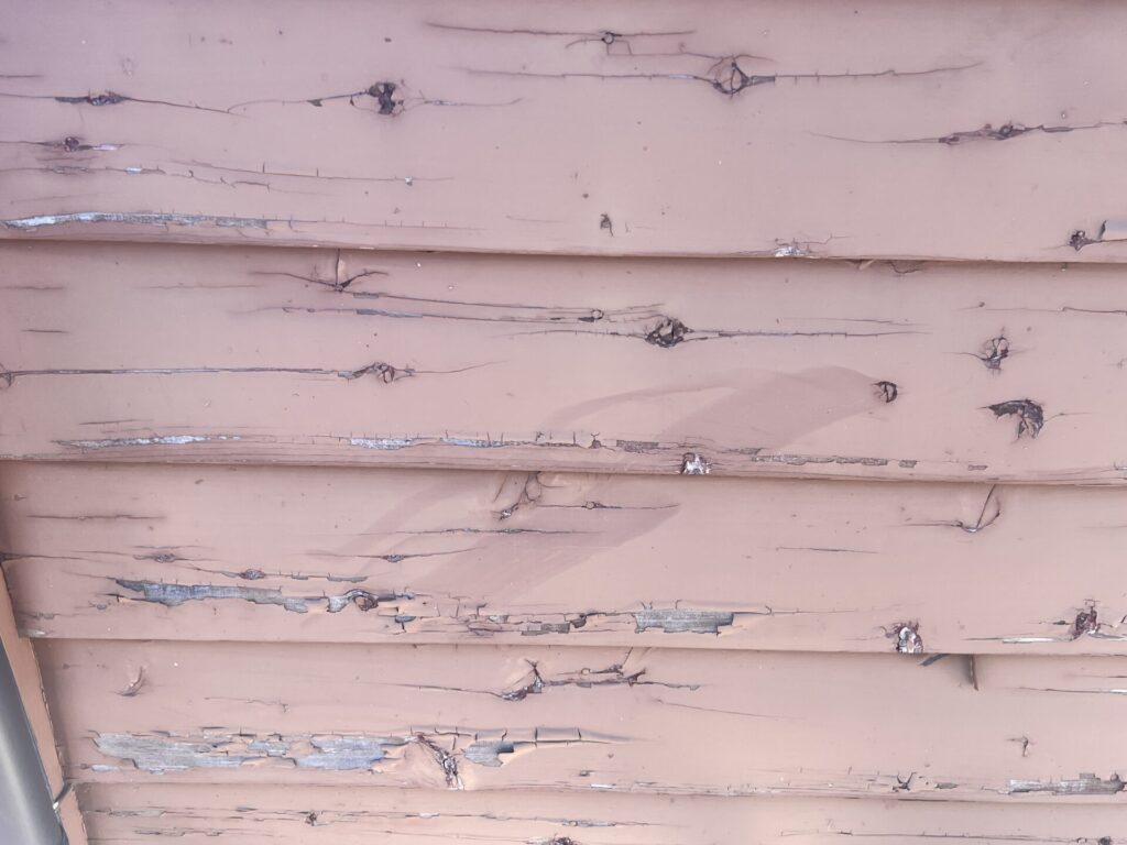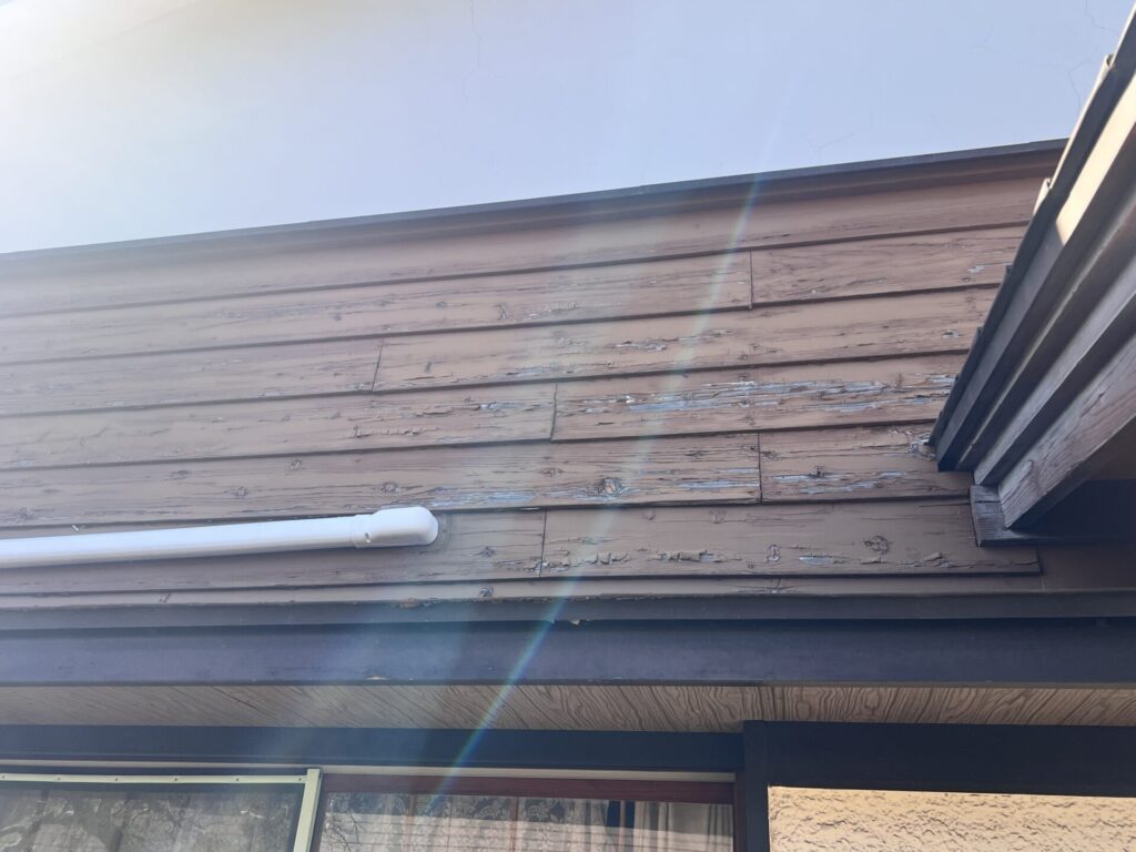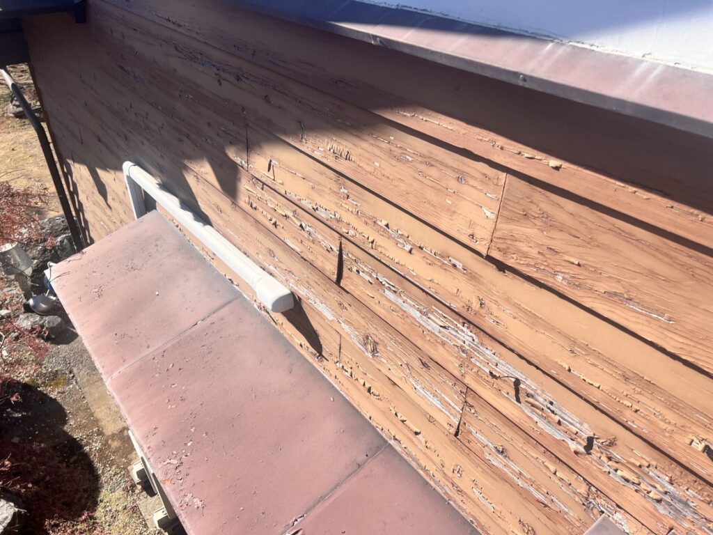 紫外線の影響がある部分とない部分の差は以下の通りです。同じ十数年前に塗装したとは思えないほど雲泥の差があります。これだけ紫外線が及ぼす影響は大きなものになります。左は紫外線の影響を受けている部分で右側は北側の紫外線の影響がない部分になります。色褪せがあるように見えますが、3分艶塗料で塗装してあるため艶はないように見えます。