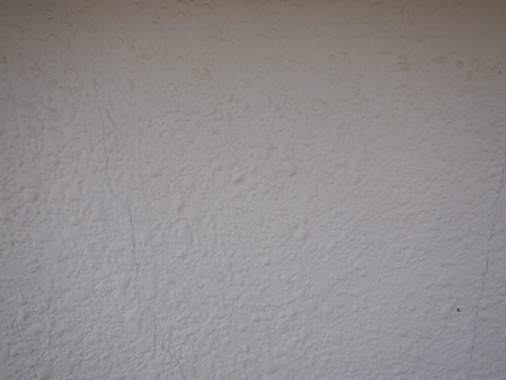 この状態が20年以上前から確認している状態で、既存はモルタルで下地の上に吹付模様仕上げになっています。太陽熱を直接受けない北面にも発生していることを考えると当時の塗材耐用劣化が考えられます。現在のような緻密で高性能、高機能に富んでいる塗料はなかったため症状の判断はできませんが、複合的要素が原因で起こっているのではないかと考えられます。現在は美観的な問題を除き外壁に大きな支障が進行していないため注視している状況です