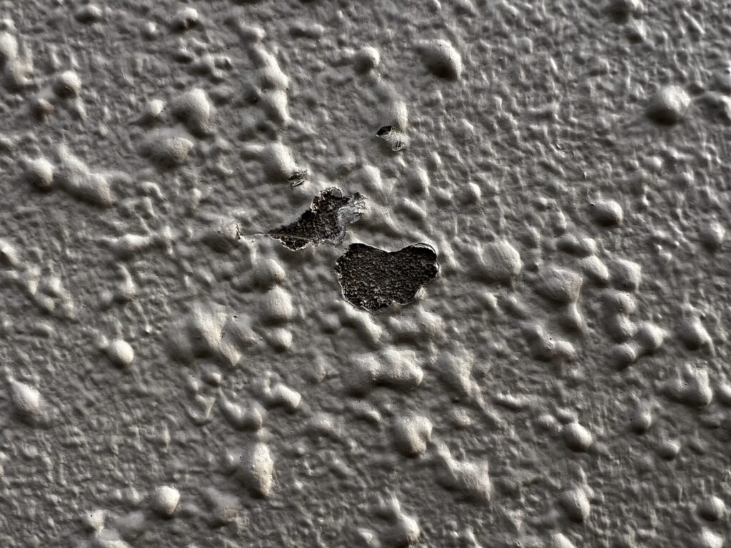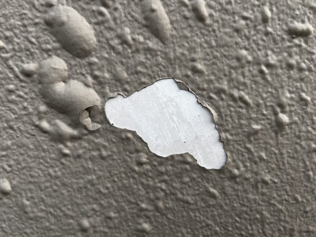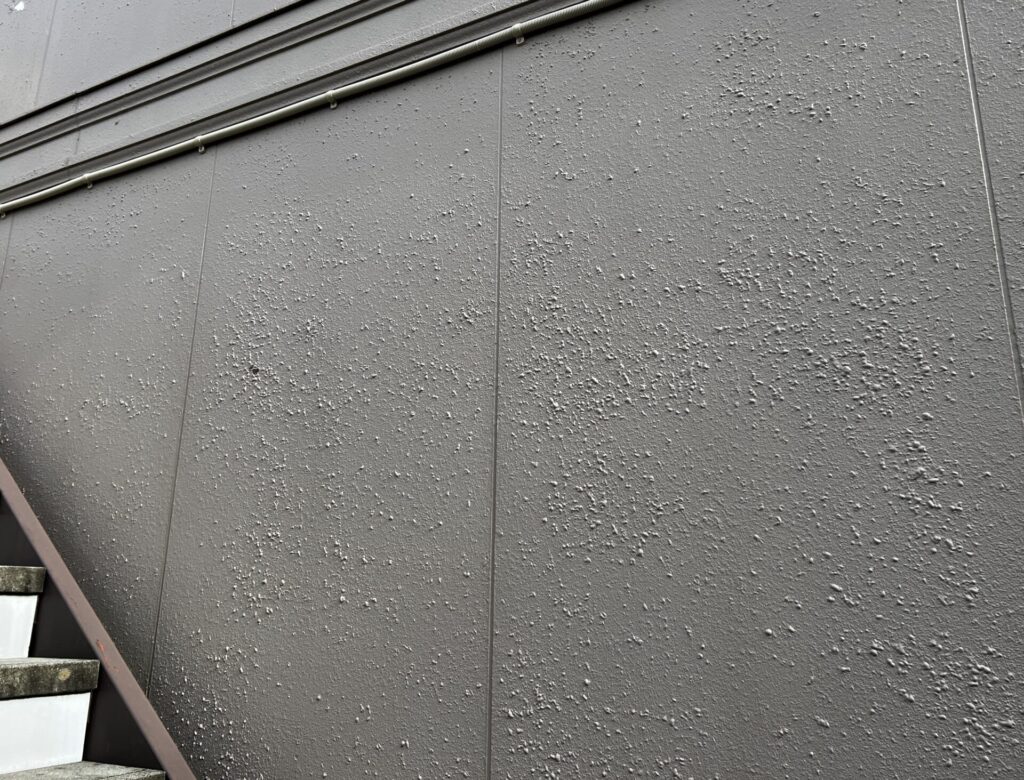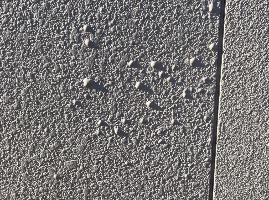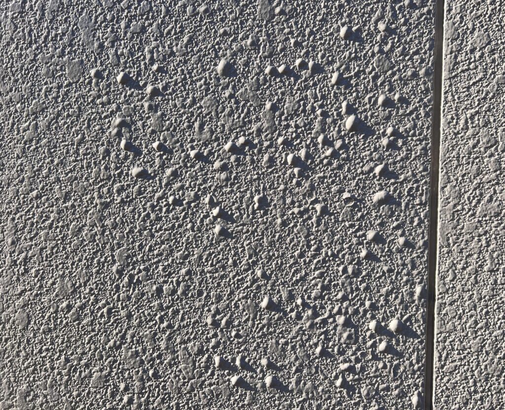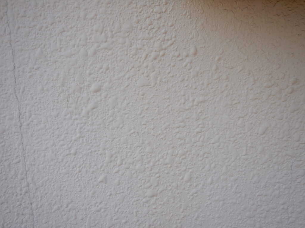 よく見ると吹付模様が膨らんでいます。こちらの建物は太陽熱に関係なく東西南北面の全体的にこの様な膨れが発生しています。特に太陽熱を浴びる部分は顕著に多く発生しています。
