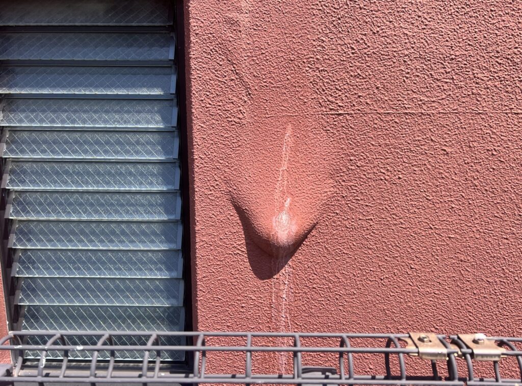 ①これは壁内部に水が入り込んだ上に防水性が高い単層弾性材塗材で「ゆず肌模様」を塗装してあることで内部水分の逃げ場がなくなり膨らんでいる状態。弾性塗料で塗装されていない場合は膨張に塗膜が追従できなくなるため表面が割れて水分が放出されるようになります。防水性能を高めることは決して悪いことではないですが、一長一短あり水の侵入口が完全に断たれている場合は有効な塗料になりますが、漏水などが発生した場合などは水が溜る構造になってしまいますので、塗装仕様を組む場合には悪い可能性を考慮することも重要になります。