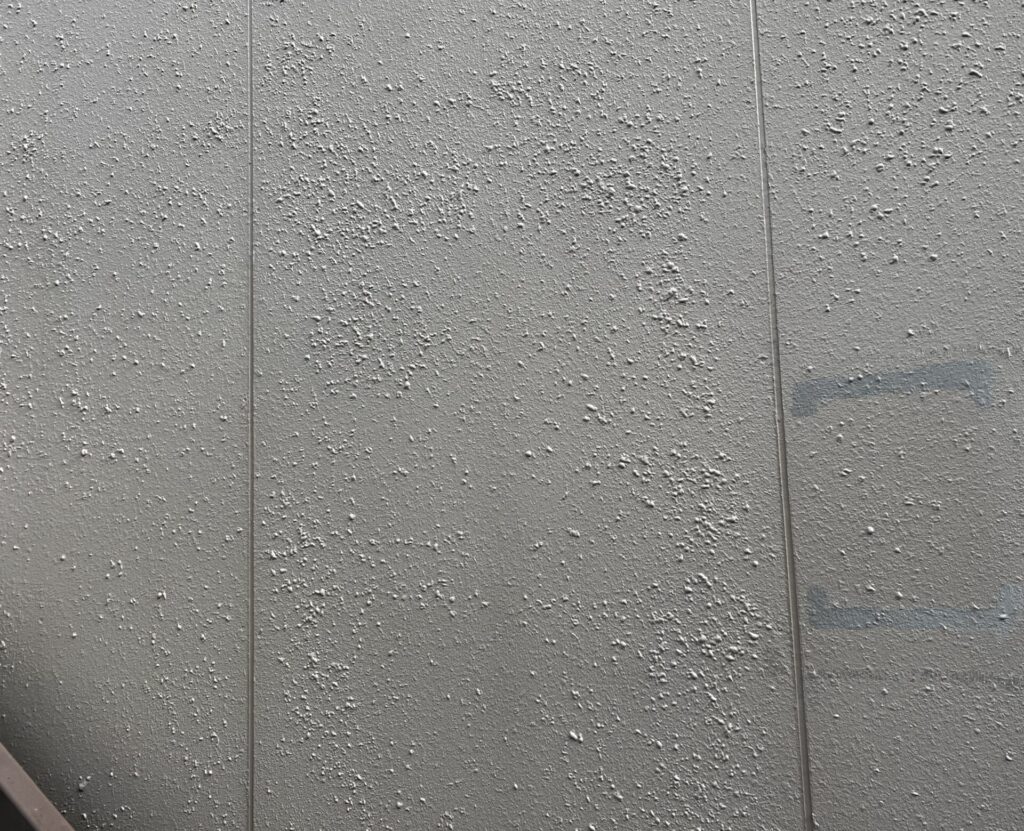 以下のように多く見られる膨れ異常は日当たりの良い部分に多く発生しています。外壁内部に微量な水分や湿気が入り込むことで、紫外線の影響を多く受けた外壁材が蓄熱し、水分と反応して膨れてしまうメカニズムではないかとも推測されますが、外装材の耐用年数劣化や塗り替え時の塗料選択ミスなどが複合的に影響していることも考えられます。また現場で吹付模様を作るのではなく工場で生産されている外装材の異常が多く確認されています。