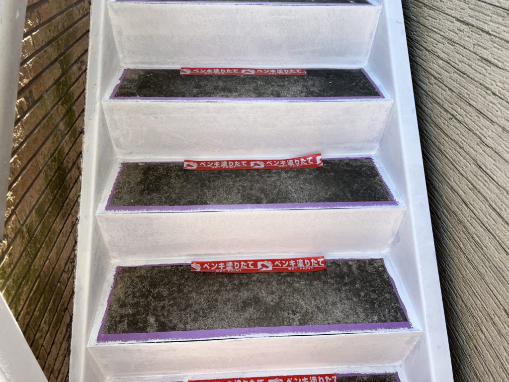 階段の踏み面にはペンキ塗りたての養生を貼って注意を促します。また踏み面のモルタルは何もしないため塗料が滲まないようにしっかり養生をして塗装をします。