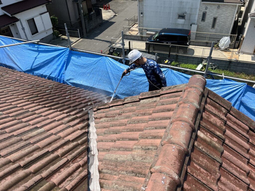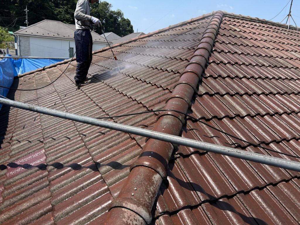 セメント瓦表面を丁寧に洗い流します。既存塗膜が剥がれる場合は剥がれるところまで落とします。現場には水道がないため大きい貯水タンクに水を汲んで行います。