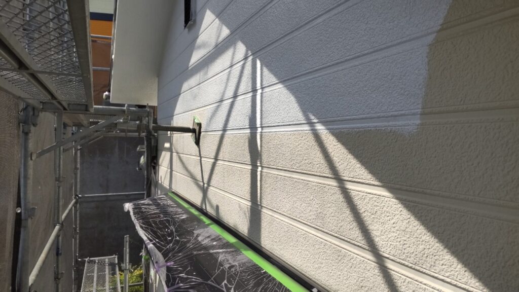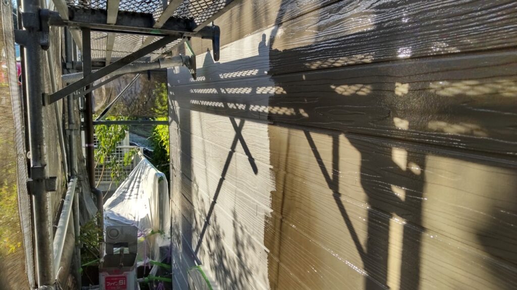 サイディングに専用下地調整材を塗装し、仕上げ塗料を2回塗ります。保護塗装としてクリヤー塗装を2回塗りし合計5回塗り仕上げになります。
