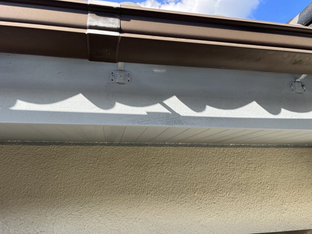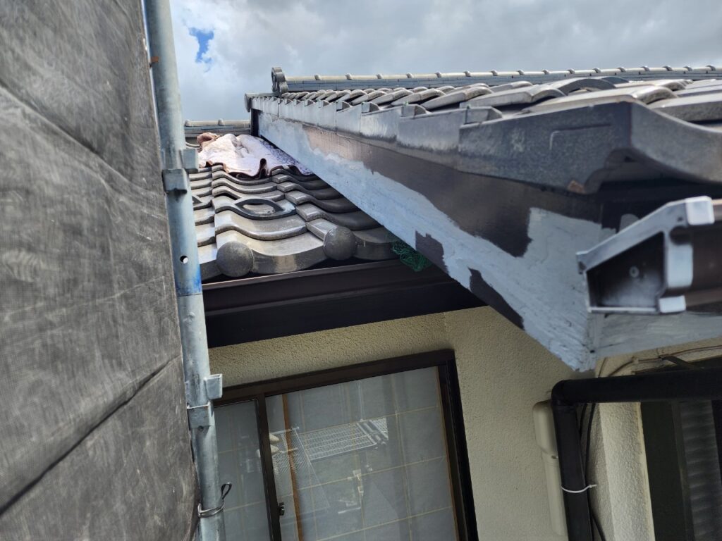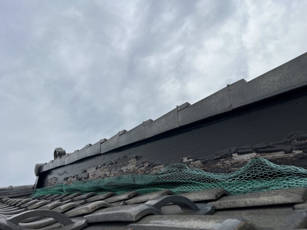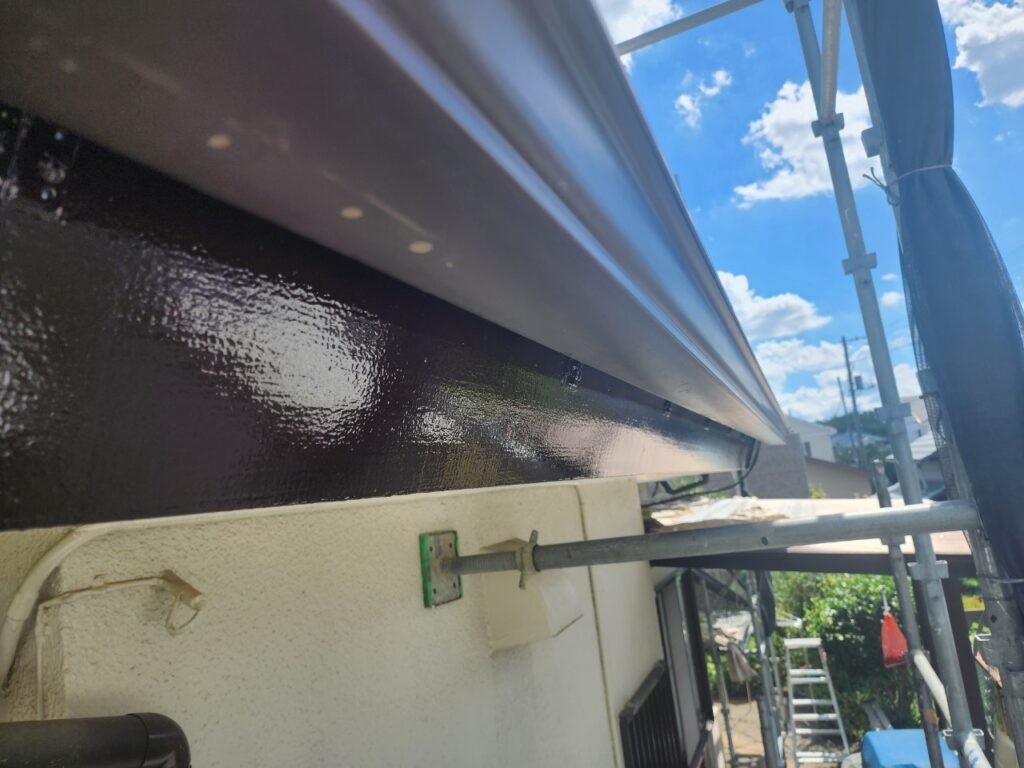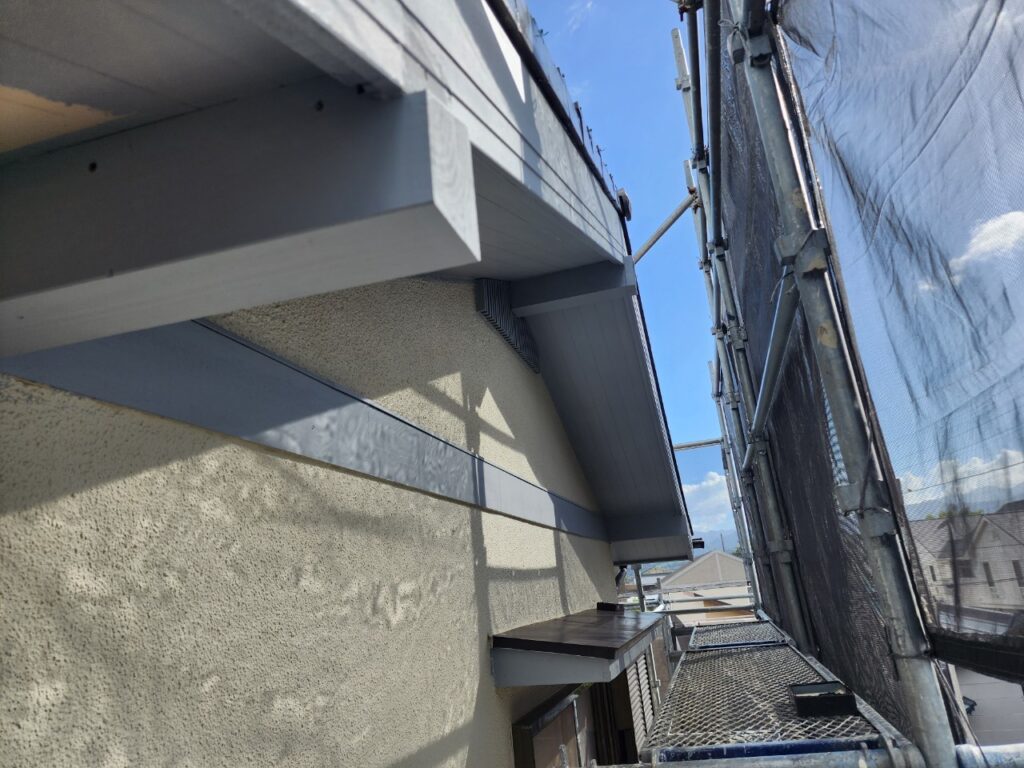 既存破風板が西日の影響による劣化が考えられるため、再塗装をしても同じ結果になる旨をご説明し、板金を巻くことになりました。既存の上から板金を巻くのですが著しく劣化していますので、下地処理をしっかり行い下塗り塗装まで行った上に板金を巻きます。その板金も西日の影響を受けることで退色が起こることを考慮し、鼻隠しと同様にフッ素塗料仕様で統一性を持って仕上げました。