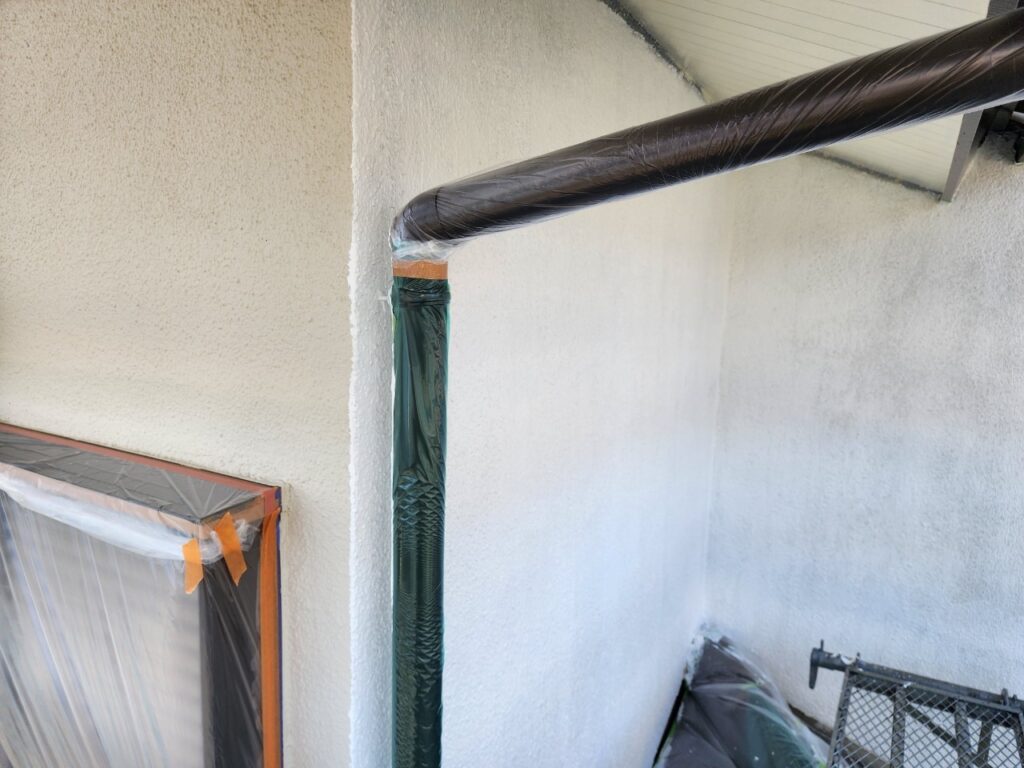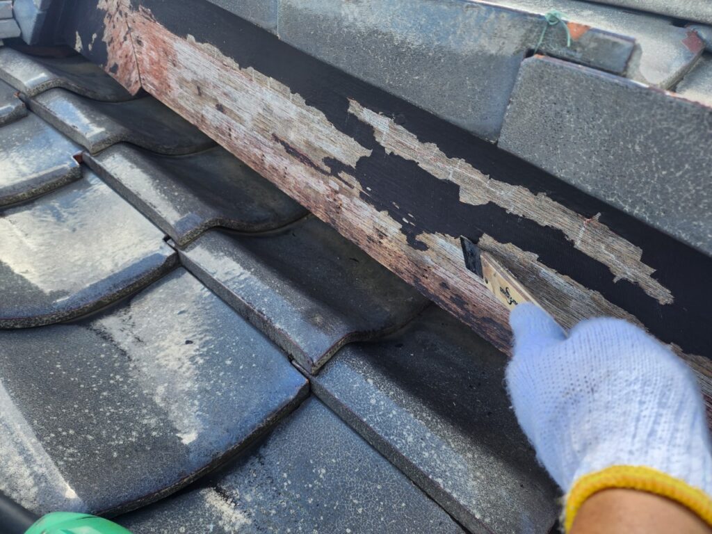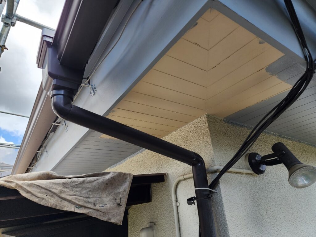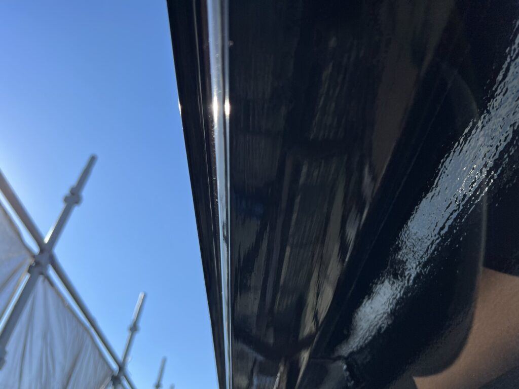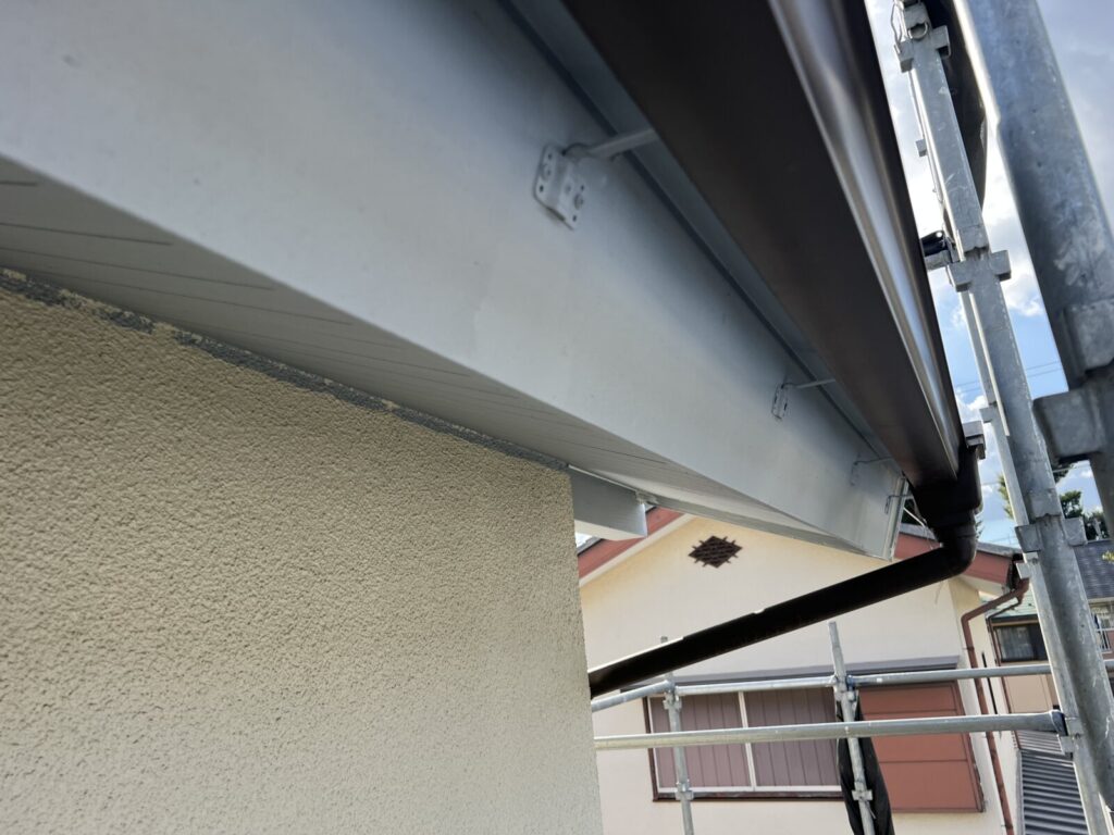 既存破風板が西日の影響による劣化が考えられるため、再塗装をしても同じ結果になる旨をご説明し、板金を巻くことになりました。既存の上から板金を巻くのですが著しく劣化していますので、下地処理をしっかり行い下塗り塗装まで行った上に板金を巻きます。その板金も西日の影響を受けることで退色が起こることを考慮し、鼻隠しと同様にフッ素塗料仕様で統一性を持って仕上げました。
