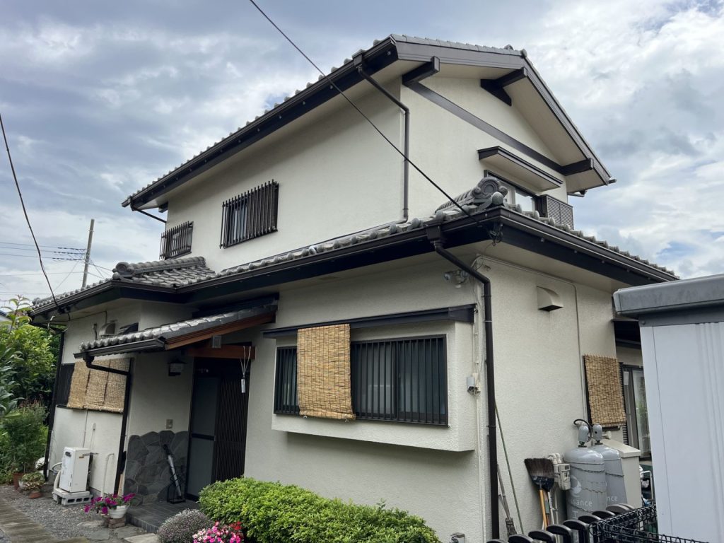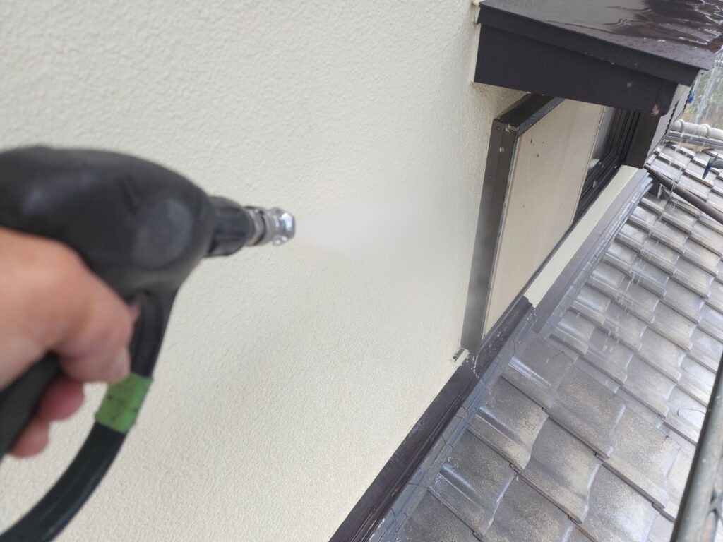 外壁塗装工事のご依頼です。屋根は瓦なので高圧洗浄のみになります。2種類のお見積りをご提出させて頂き、フッ素塗料をお選びになられました。先日有名俳優様宅のご自宅を塗装した職人さんの作業になります。
