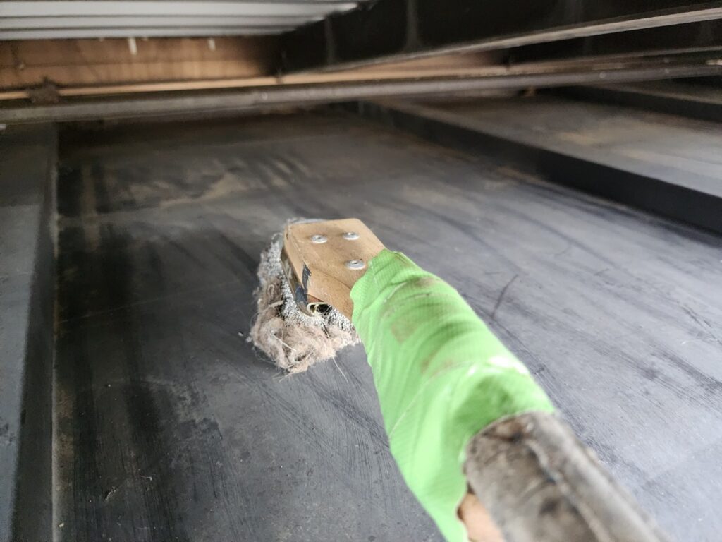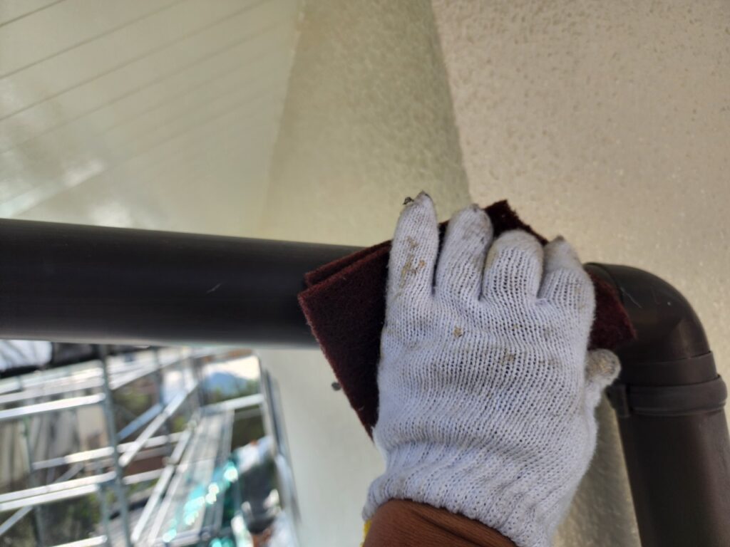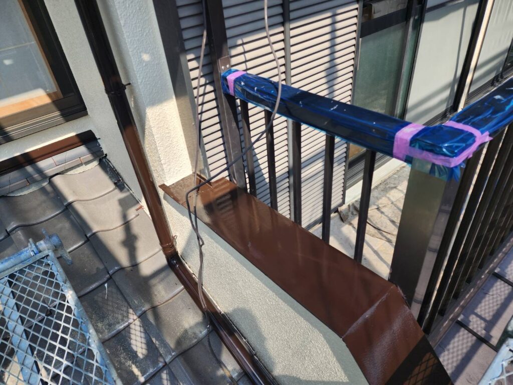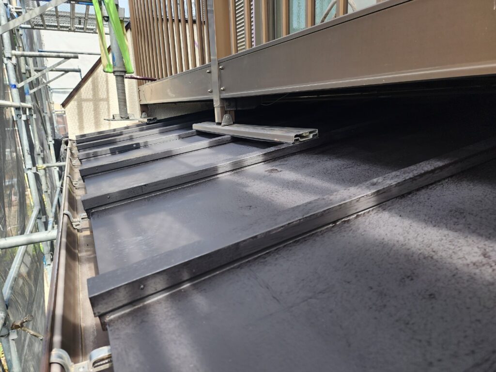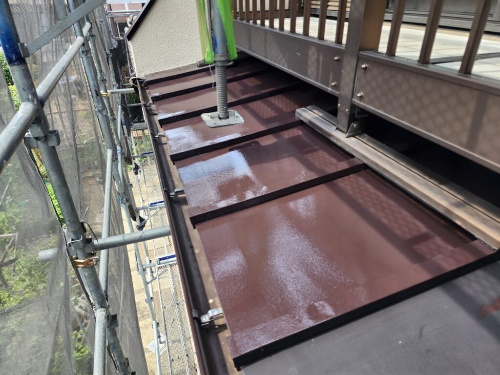 バルコニー下のトタン屋根も手の届かない部分までしっかりとケレン処理をして塗装します。
