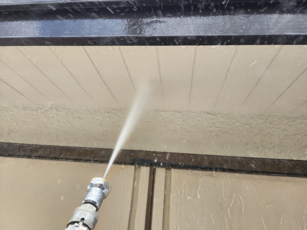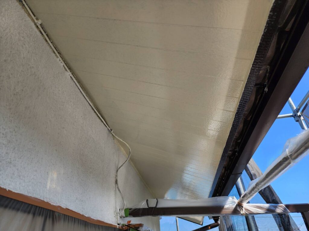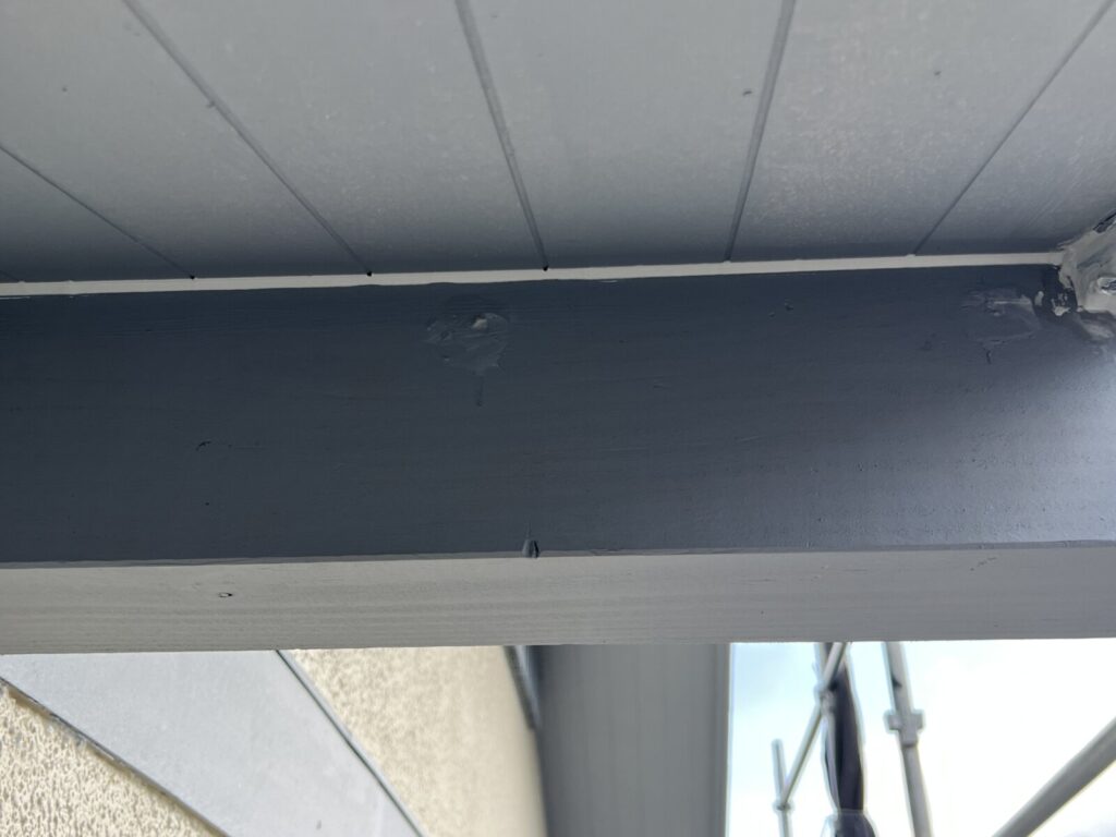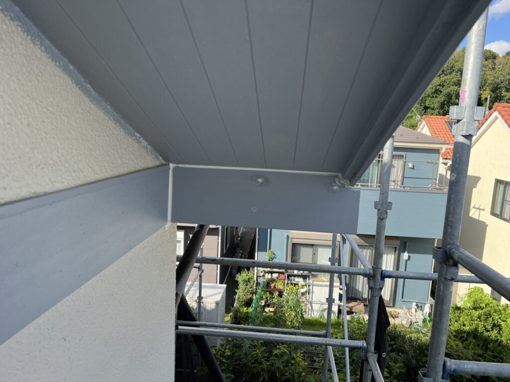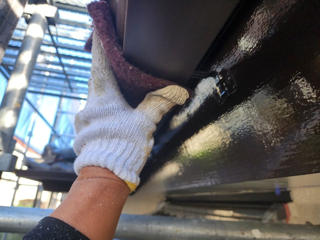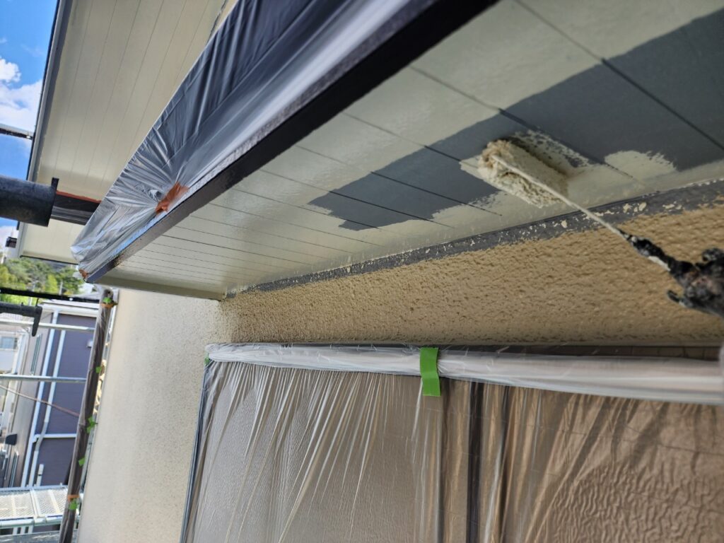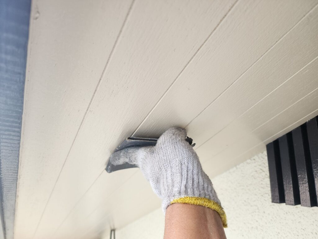 軒裏の木製素材の下ケレンをしっかり行い、重防食下塗り塗料を塗装します。