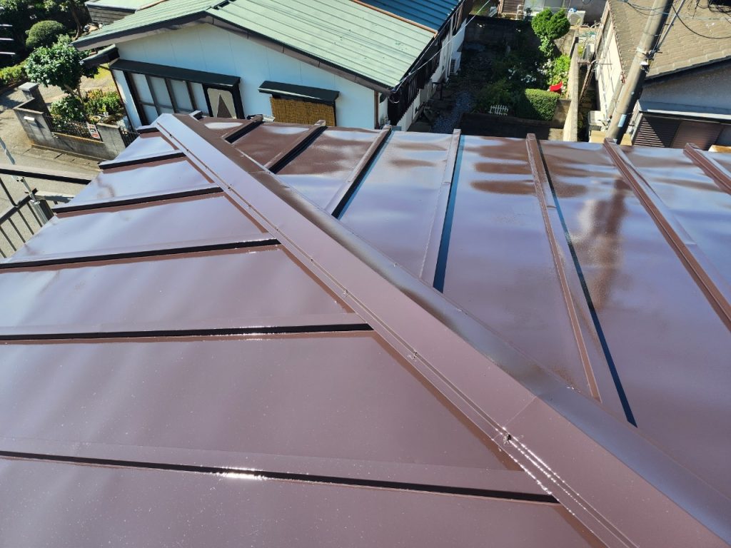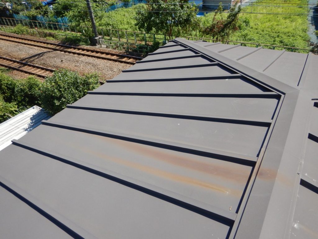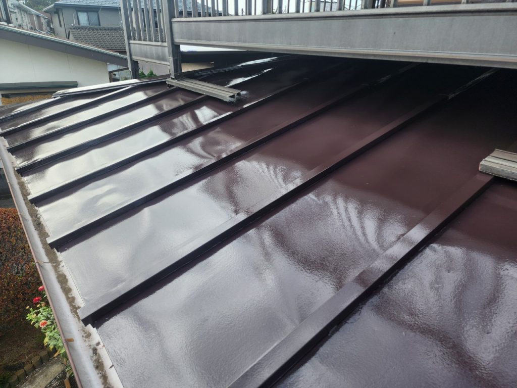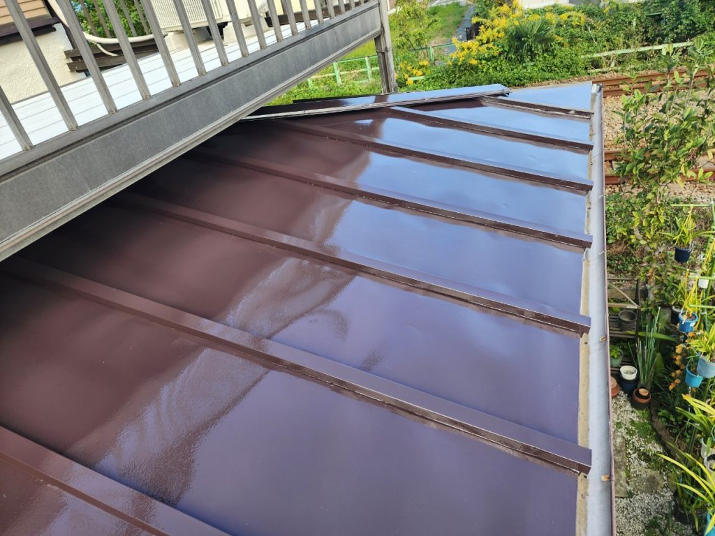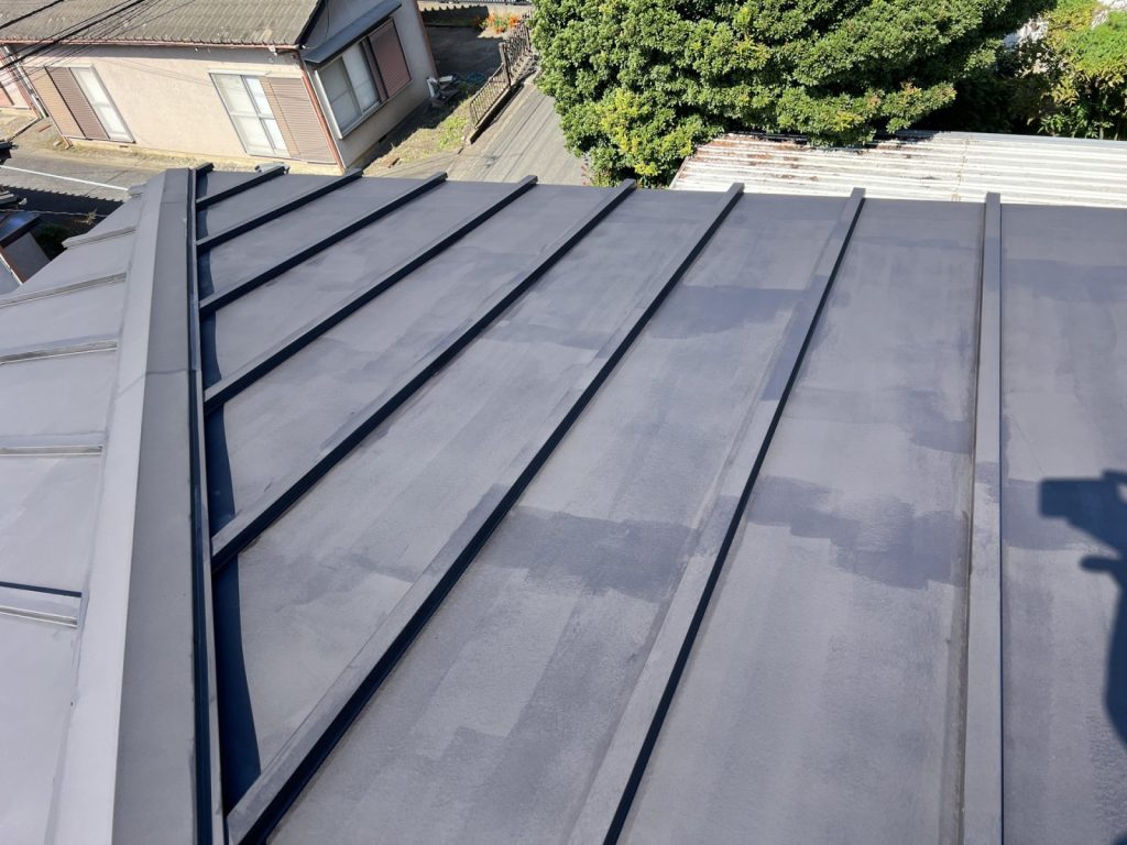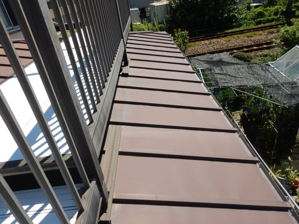板金屋根のみの塗装工事をさせて頂くことになりました。傾斜がないことから足場を組まずに行いました。