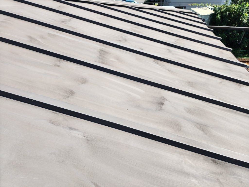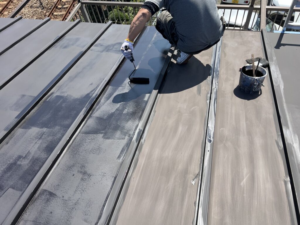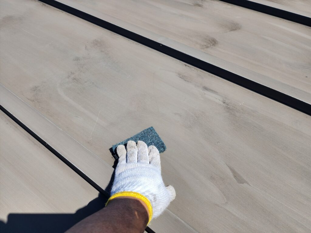 上屋根はガルバリウム鋼板になっていて、下屋根はトタン屋根になります。屋根全体をサンドペーパーなどでケレン足付を行い塗料の密着を良くします。