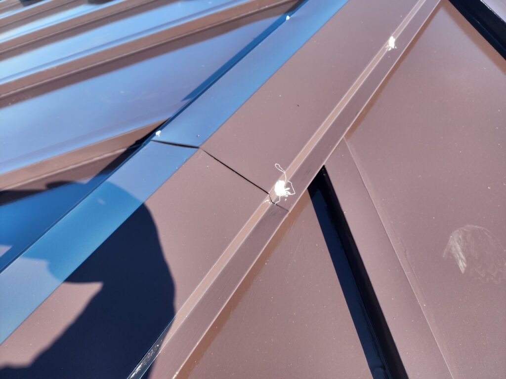 棟板金の釘頭にシーリング材を充填し釘が抜けないようにします。
