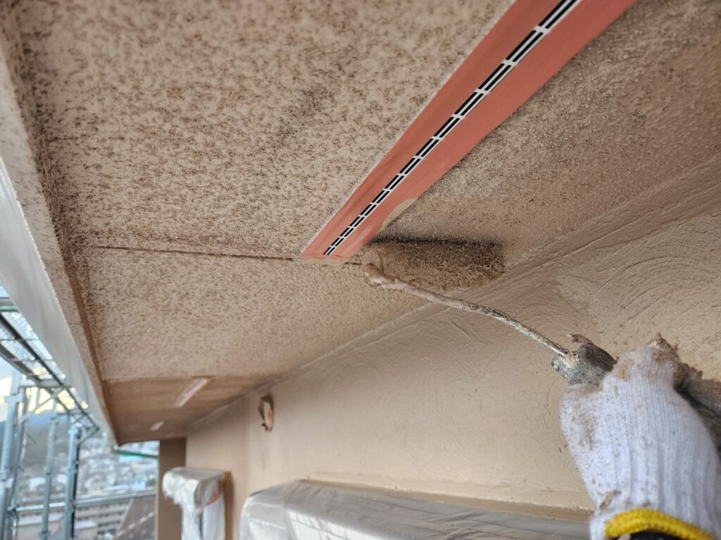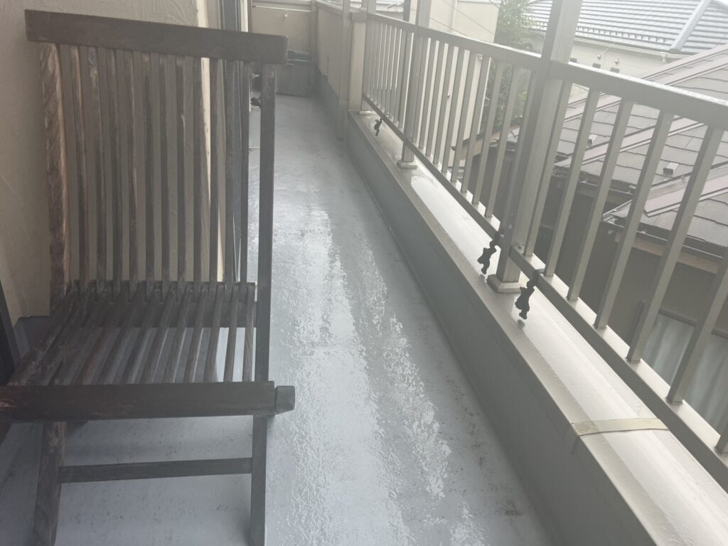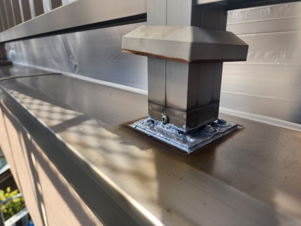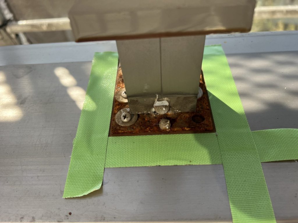 バルコニー手摺柱根元から錆の跡が滲んでいたためカバーを上げた所、錆が著しく発生していたため、アルミニウム顔料のエポキシ系さび止めを塗布しフッ素塗料で保護塗装を行いました。この部分はなかなか気付くことが困難なため結果としては良かったです。