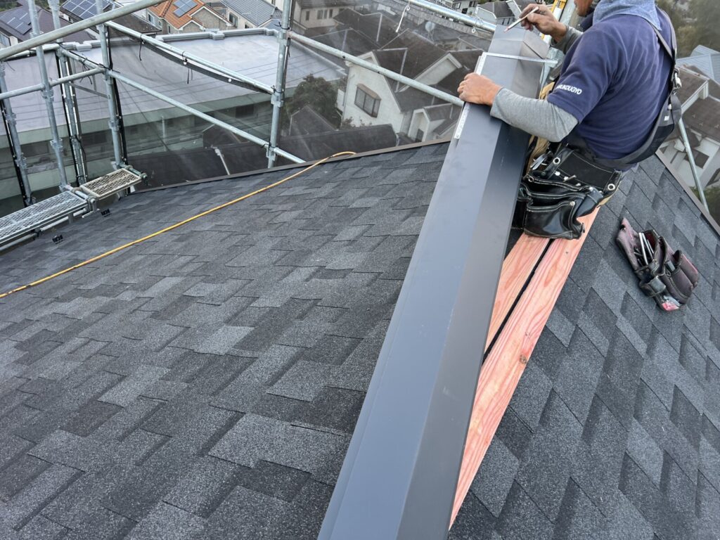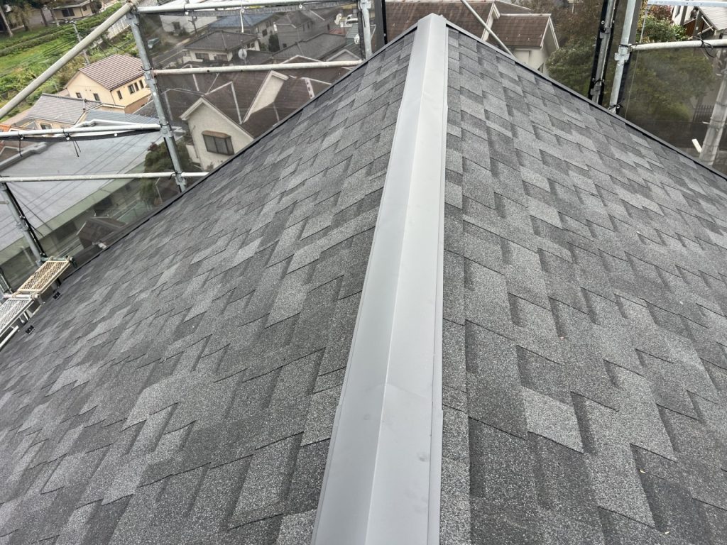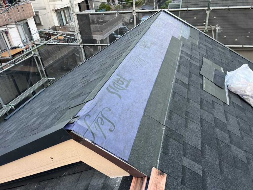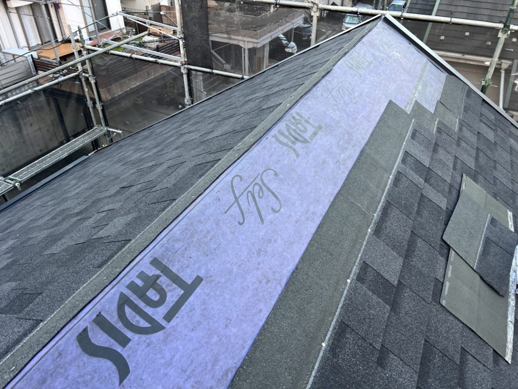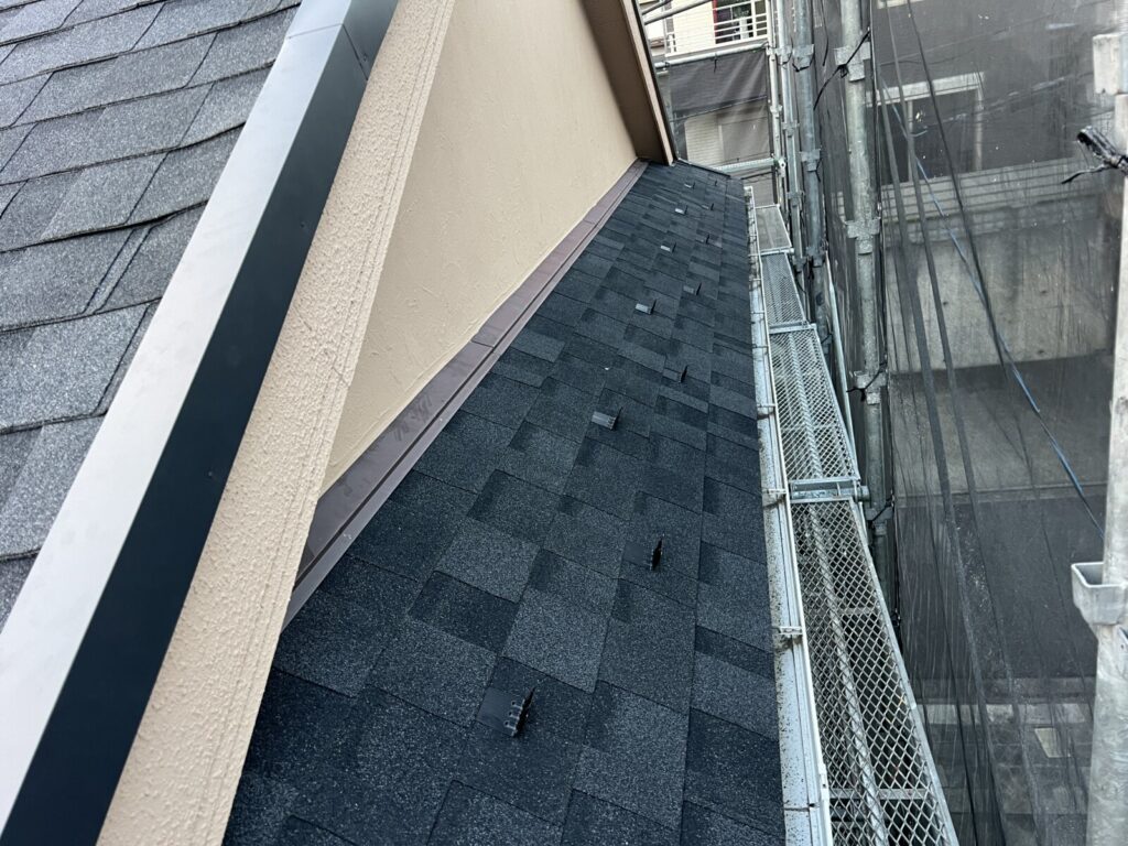 アスファルトシングルのカバー工法を行いました。ルーフィングと言う防水紙を既存屋根に貼り付けます。次にアスファルトシングル材を下から上に向かって貼り付けていきます。