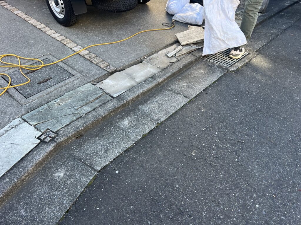 駐車場の化粧石の欠損とタイル目地、表面の欠損があり、気にされていたことからご相談を賜りました。このタイルの現象は製品上の問題か、凍害によるものか判断が出来ませんでしたが、化粧石の欠損は割れやすいことが分かり、お見積りをさせて頂く運びとなりました。