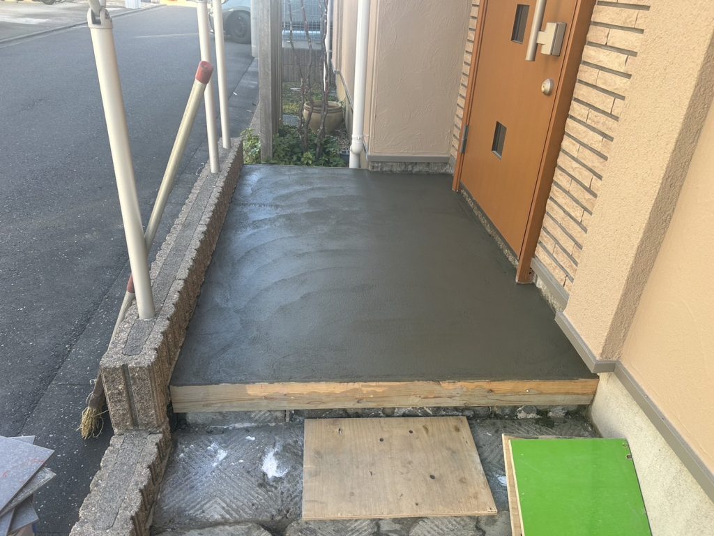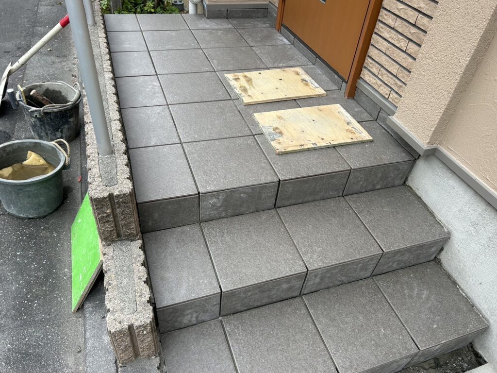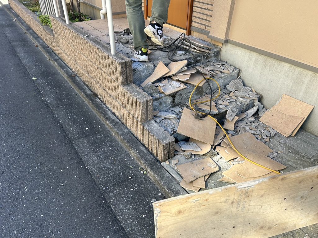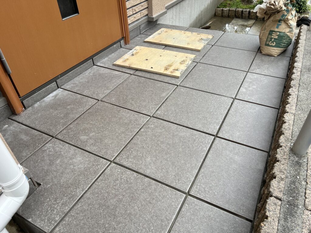 玄関の下地モルタル塗りの次にタイルを張っていきます。