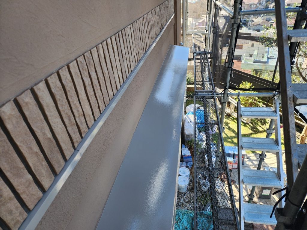 基礎水切板金もさび止めの上、仕上げ塗料を2回塗りして仕上げます。雨樋はフッ素塗料を2回塗りして仕上げます。