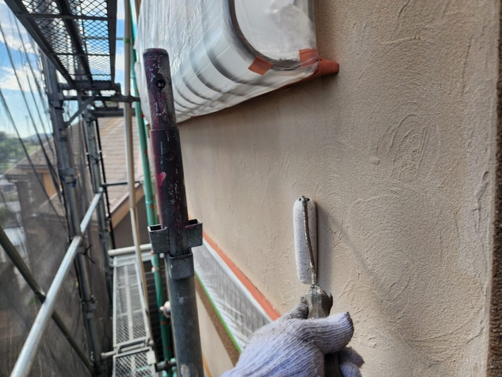 軽微なひび割れにカチオンフィラーにて擦り込んで処理します。次に外壁全体に専用水性カチオンシーラーを塗装します。