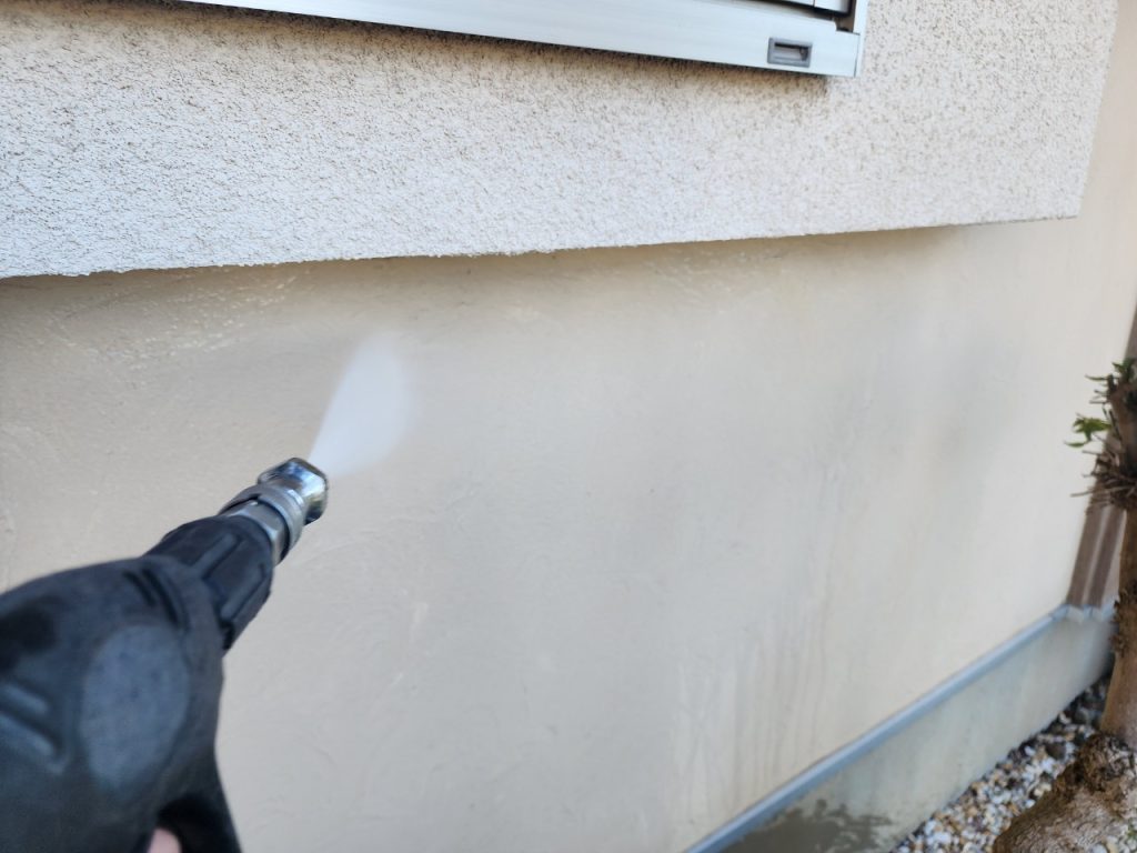高圧洗浄機にて全体を洗い流していきます。洗浄が不十分の場合、塗料の密着不良を起こす場合がありますのでしっかりと洗浄します。