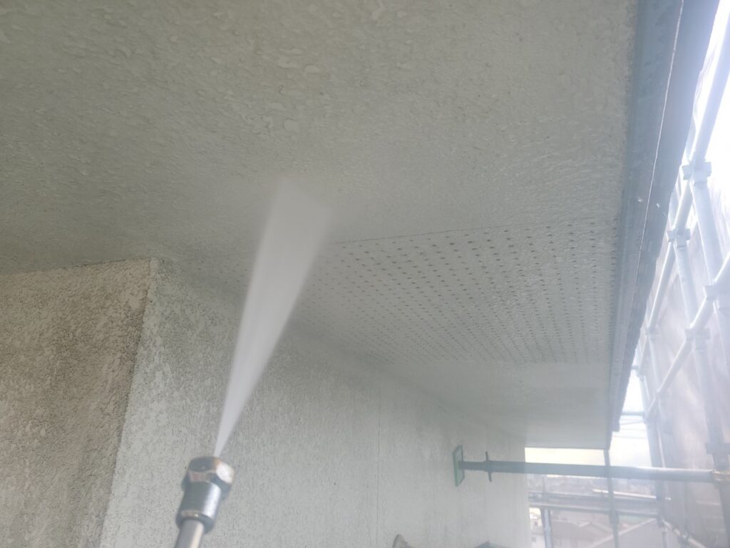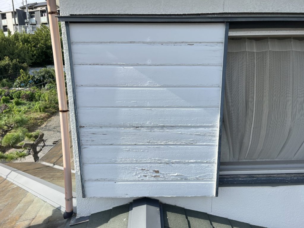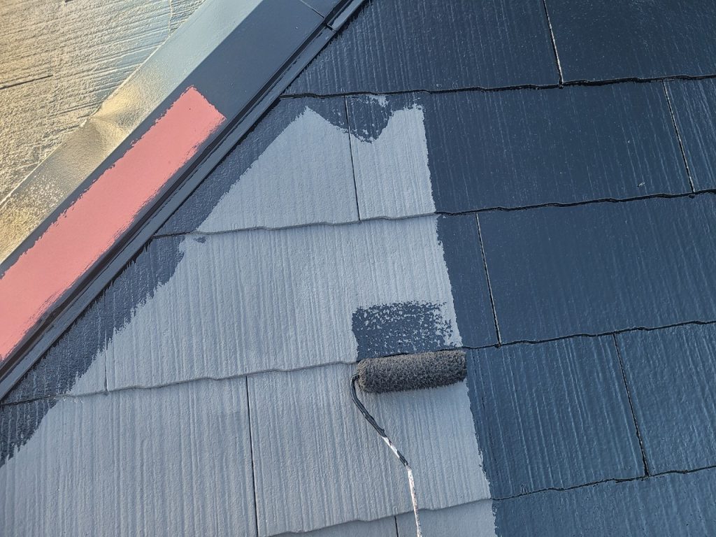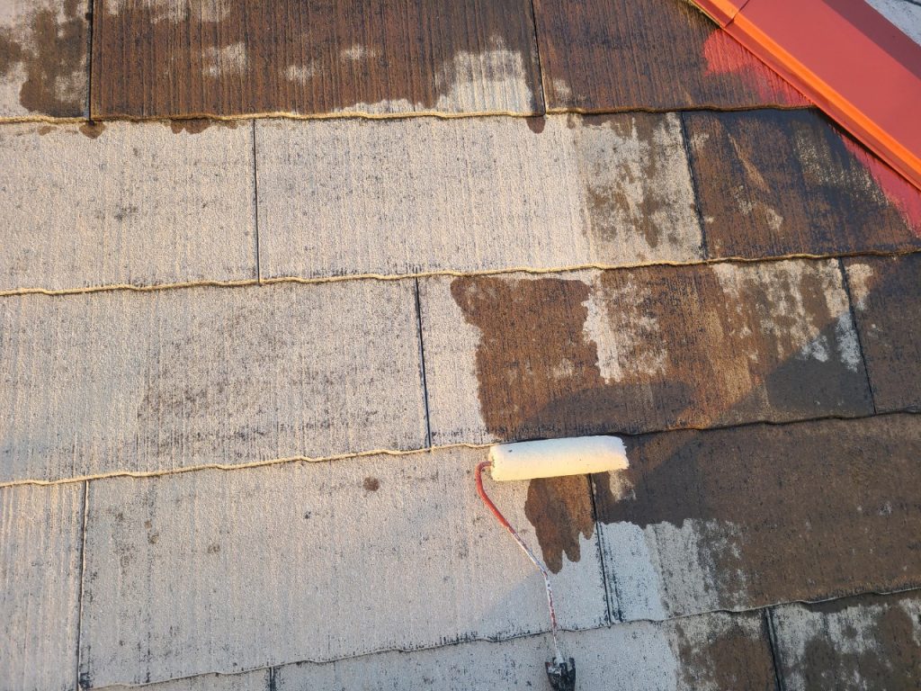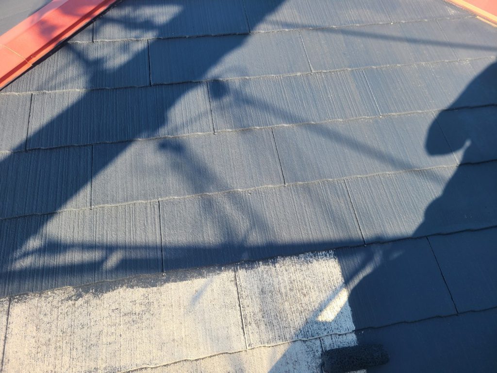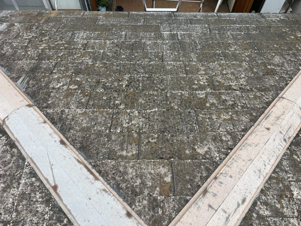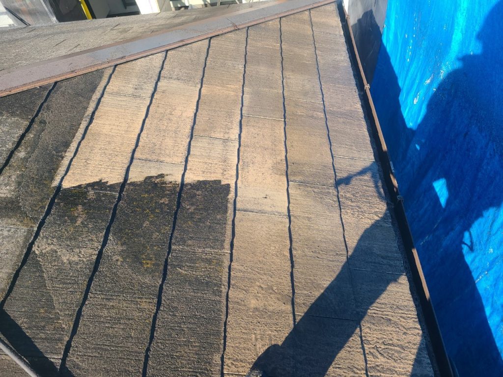 一度も塗装をしていないスレート瓦屋根です。高圧洗浄によって基材表面がきれいに剥がれて、スレート表面が露になります。この場合のアオイの塗装仕様としては下塗りを塗装し、下地調整材、仕上げ塗装の順に4~5回塗りの設定になります。