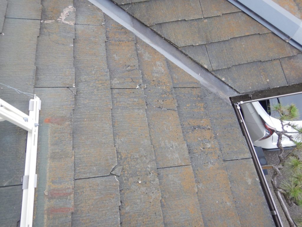 上屋根は瓦ですが下屋根はスレート瓦がノンアスベスト材のため劣化が著しく下記写真のように歩くだけで割れてしまう材質なためカバー工法を行いました。部分的に劣化が著しい部分がありましたので板金を巻いたり、雨樋を交換したりと修繕を行いました。全体的にとても良く仕上がっています。