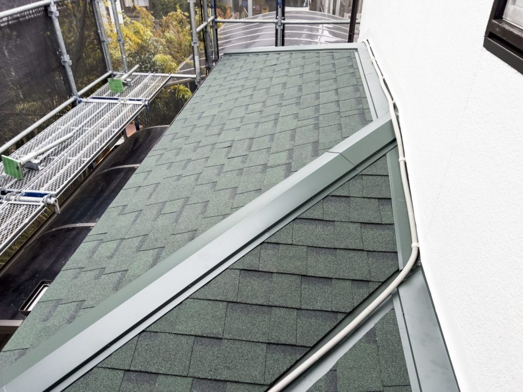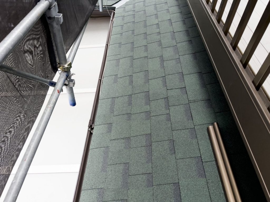カバー工法によりグリーン系の屋根を選ばれました。外壁のアイボリー系とグリーンの調和がとても良い感じの仕上がりになっています。アルミのベランダは一旦取り外して下までしっかりと屋根工事をして復旧しました。