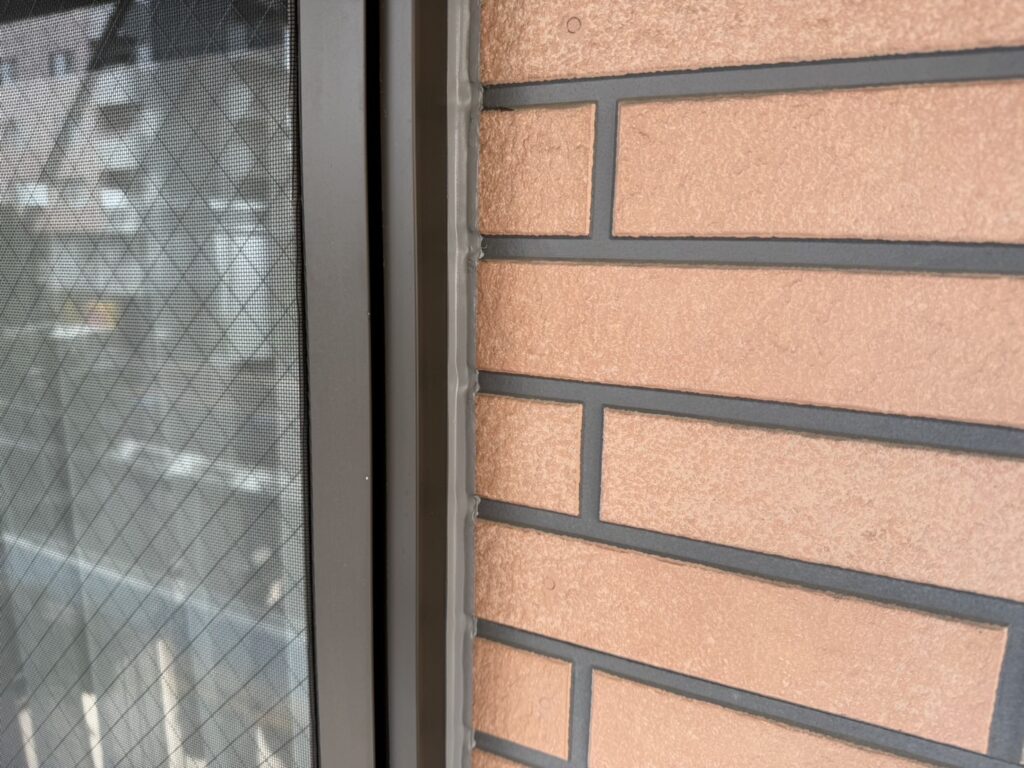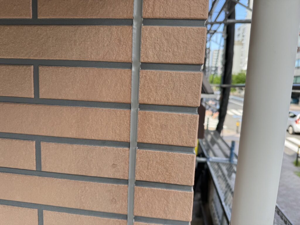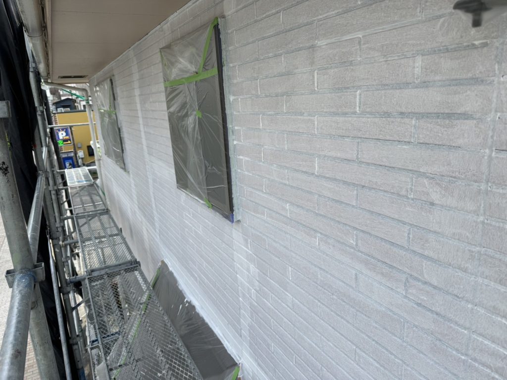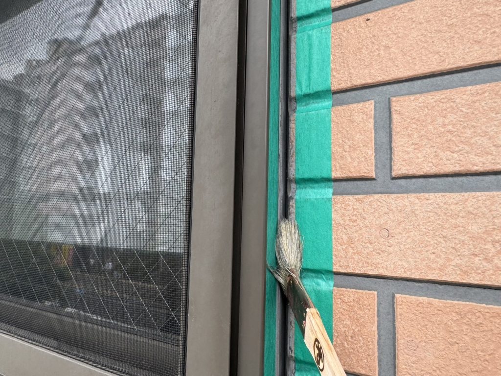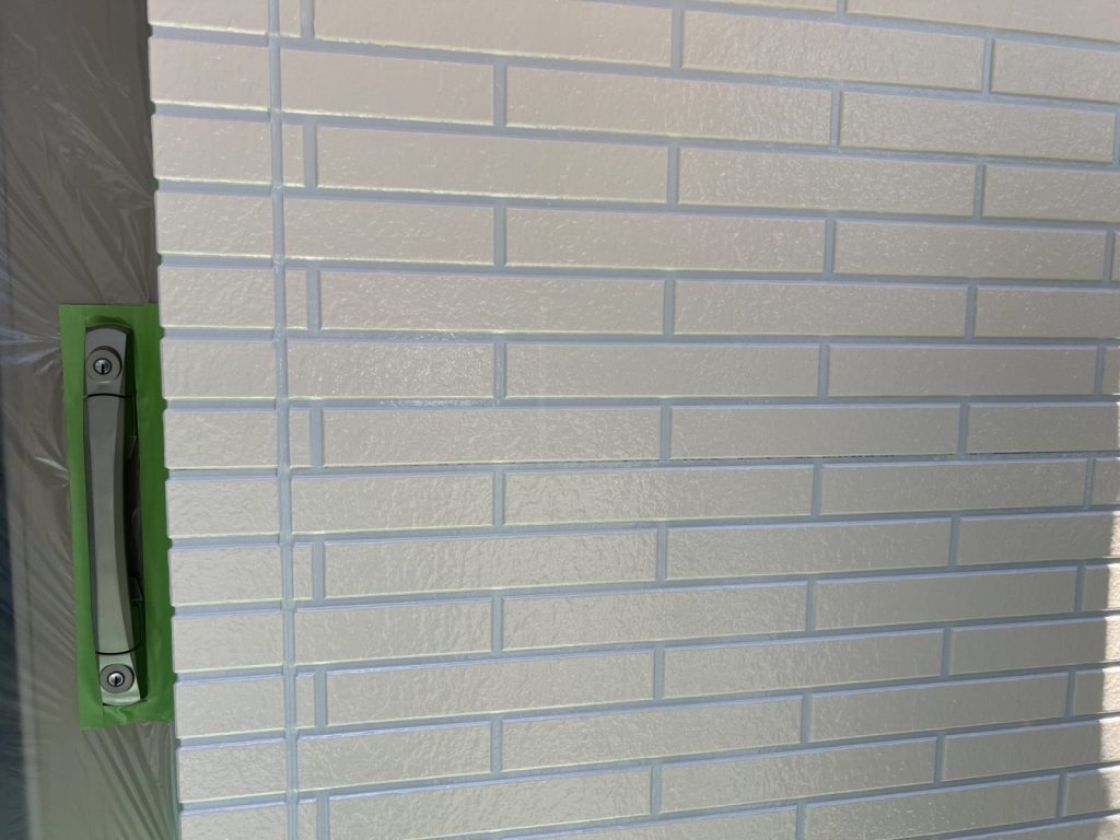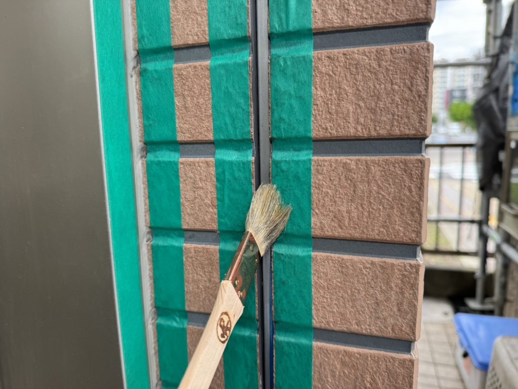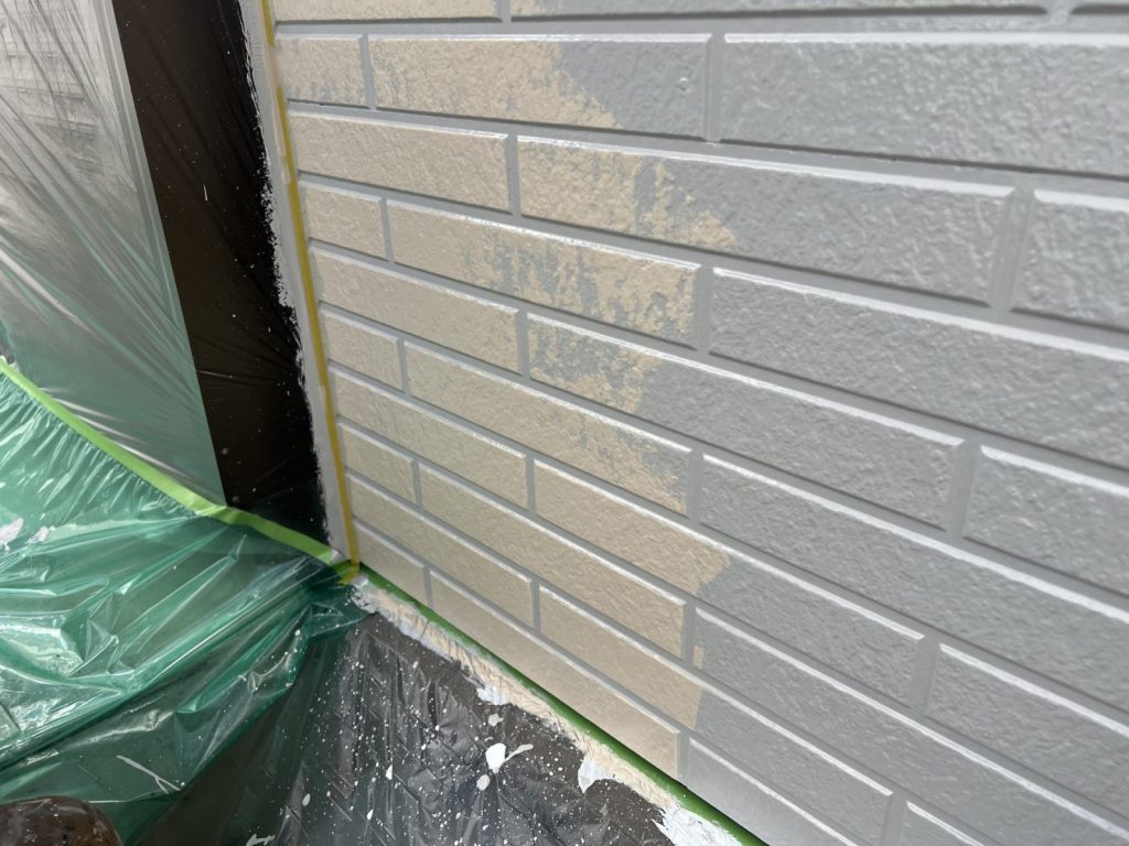 タイル調サイディングの2色塗装になります。まずサイディング用下地調整材を塗装します。