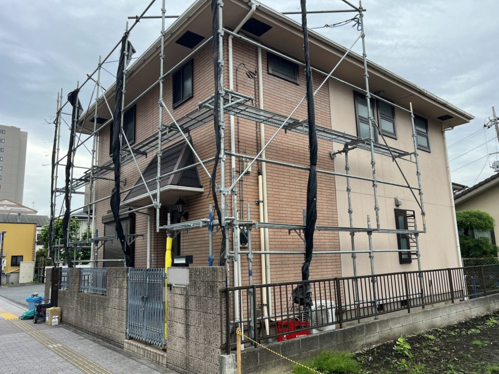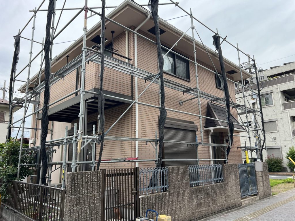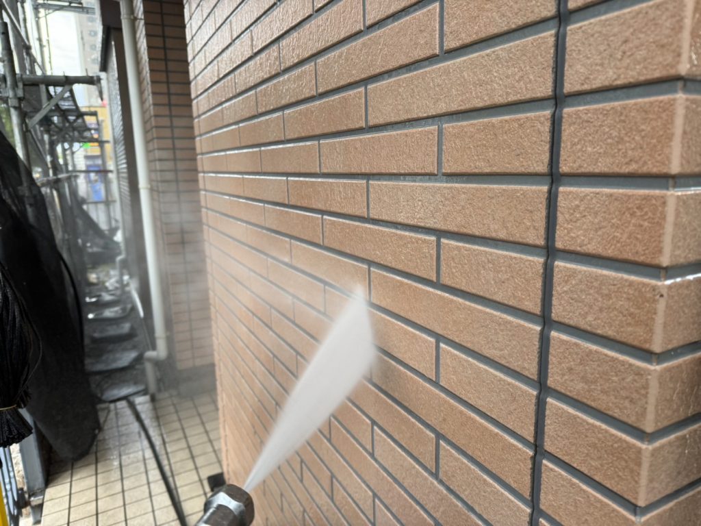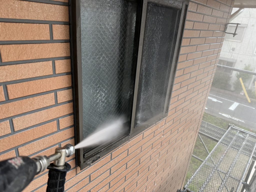 塗装部分の外壁表面に付着している埃などを洗い流します。
