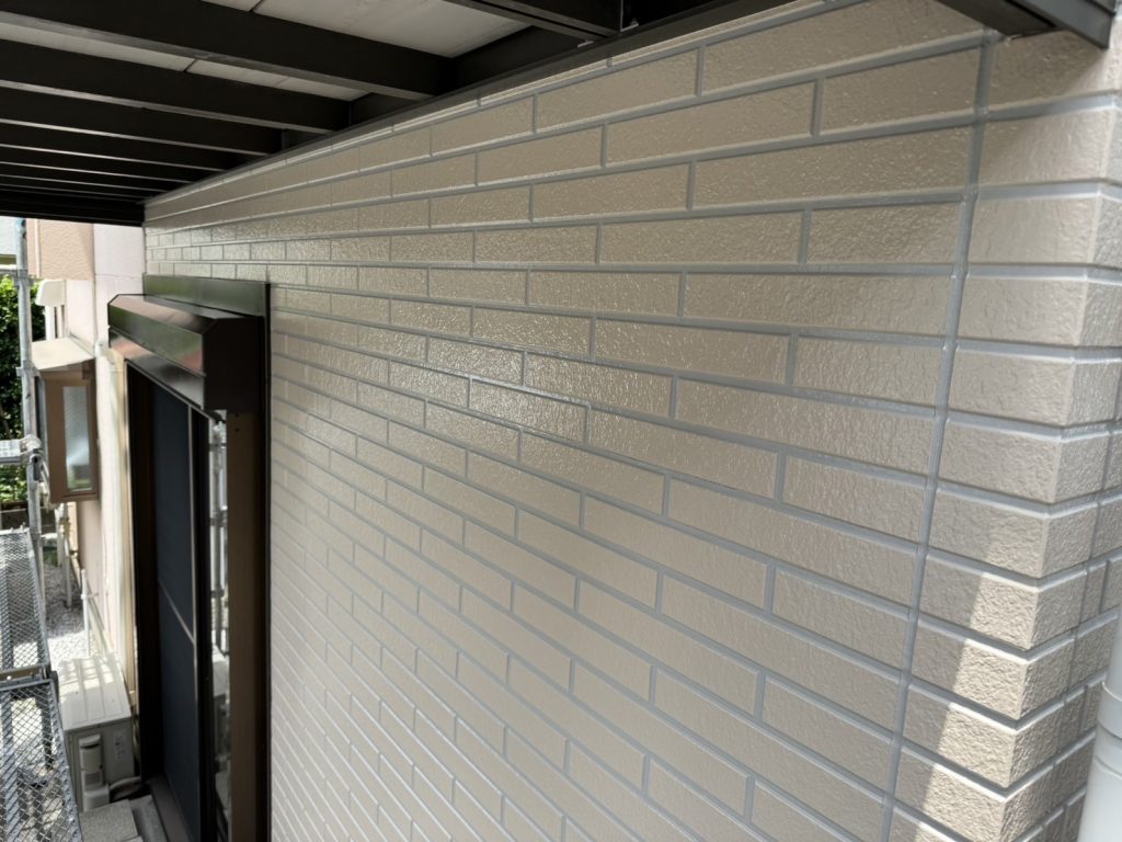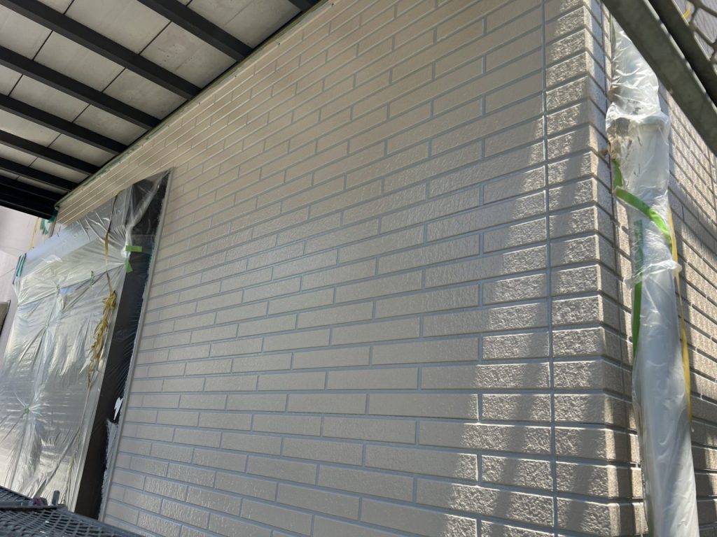 2色塗装の場合凹んでいる部分の塗装をしていきます。目地色になるグレー色を全体に塗装します。乾燥後に、表面の凸部に仕上げ塗装を目地に付けないように丁寧に塗装していきます。必ず目地に付着しまうため補修塗装を行います。