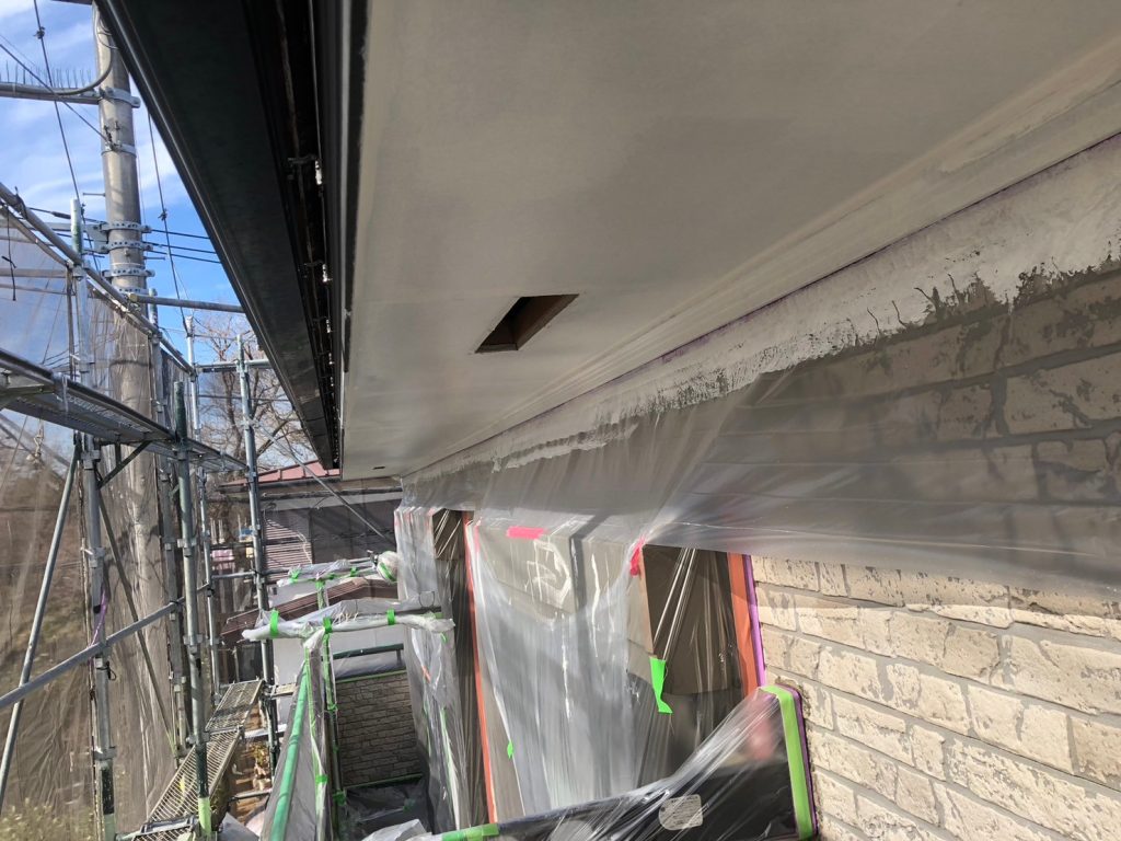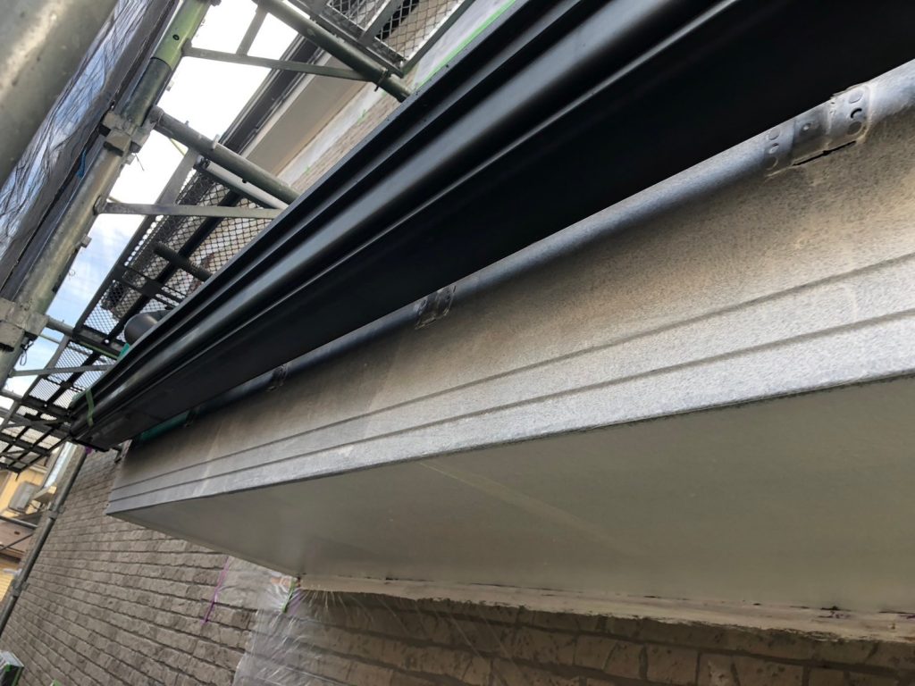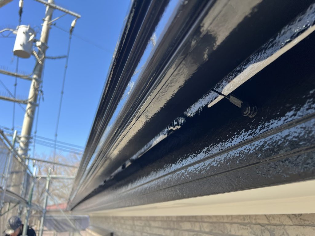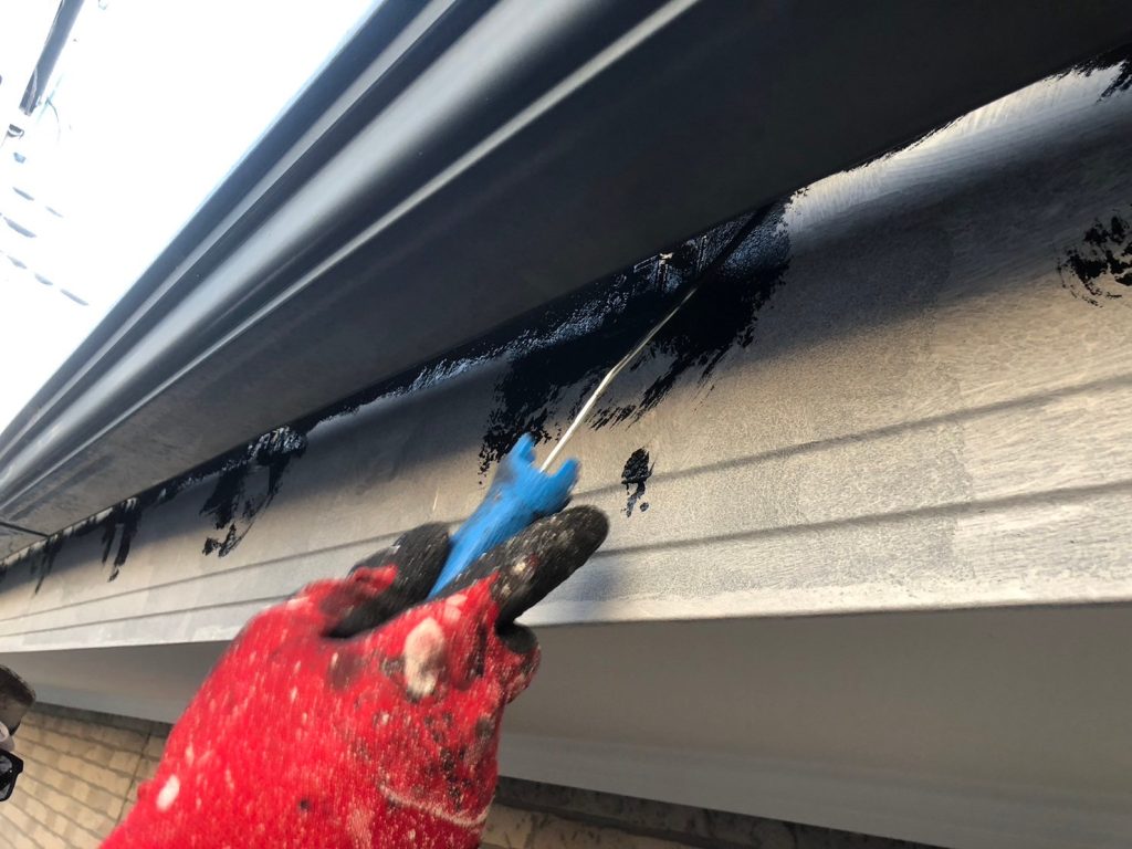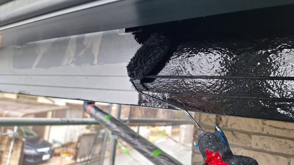 鼻隠しと軒樋の間の奥もしっかりと塗装します。仕上げはフッ素塗料を2回塗りして仕上げます。