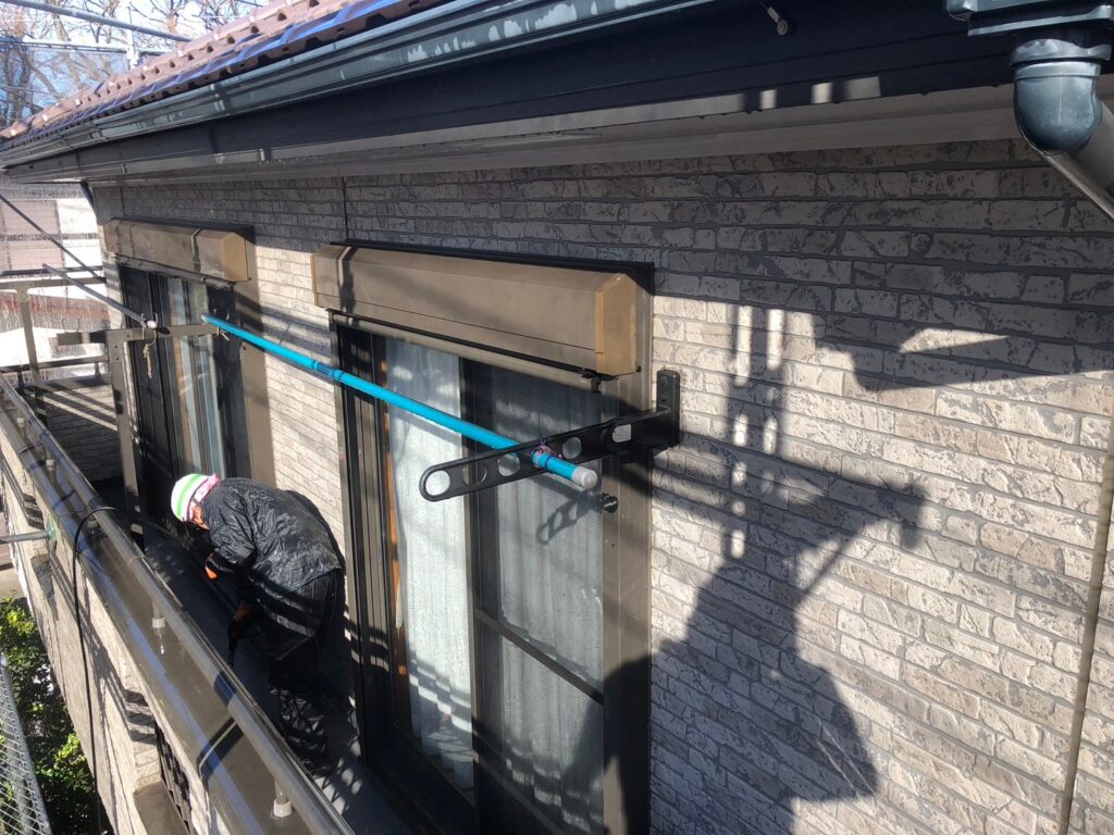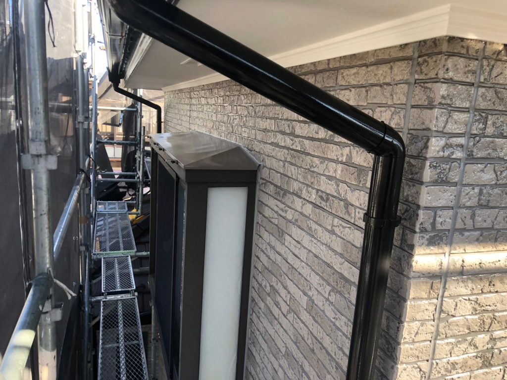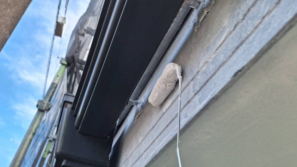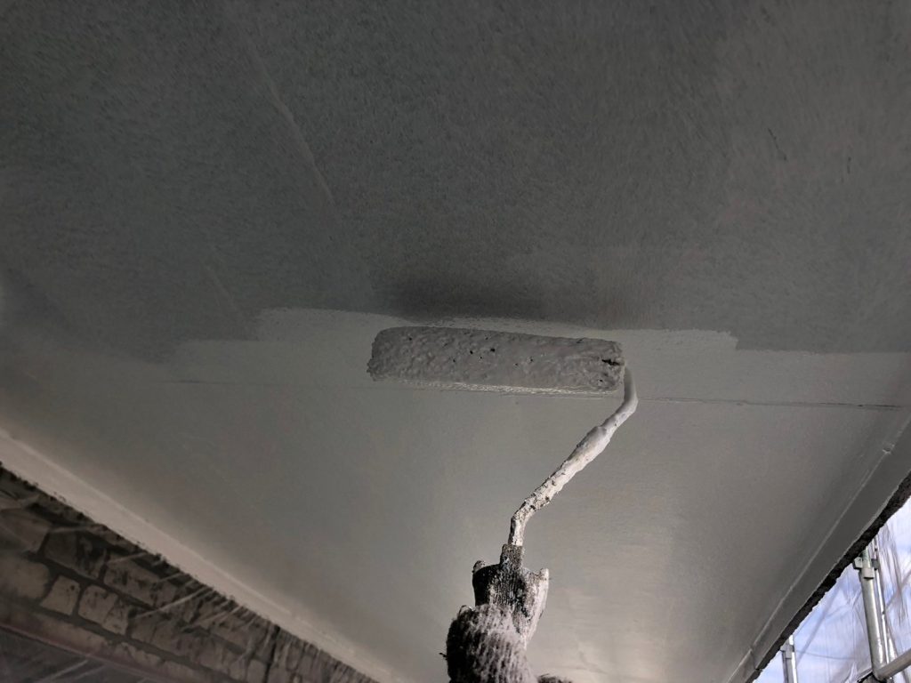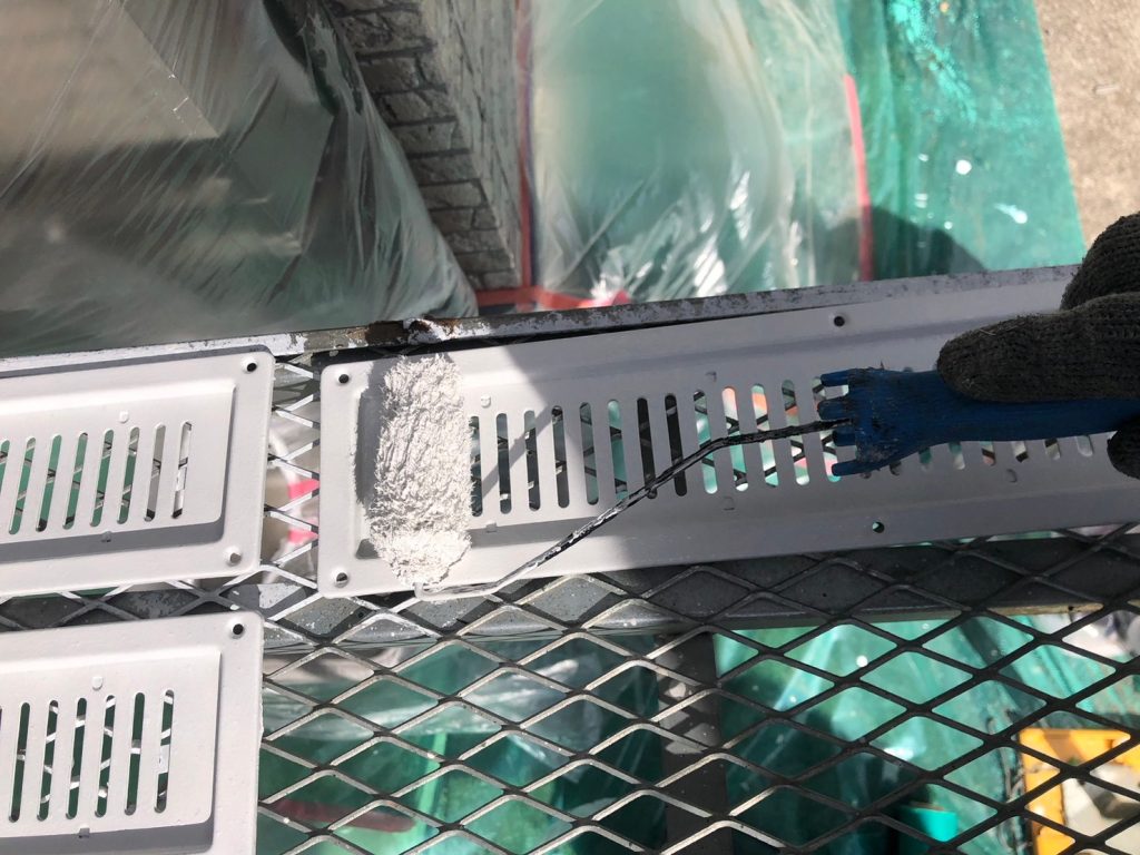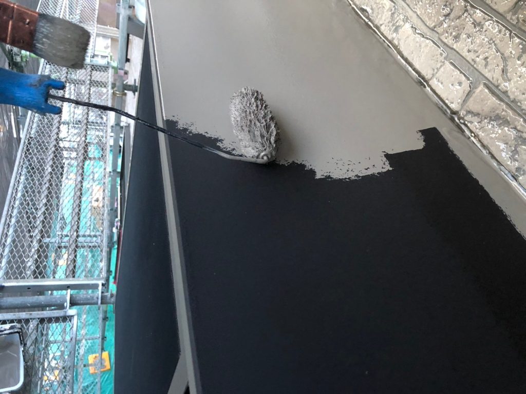 鼻隠しと軒樋の間の奥もしっかりと塗装します。仕上げはフッ素塗料を2回塗りして仕上げます。